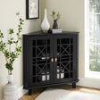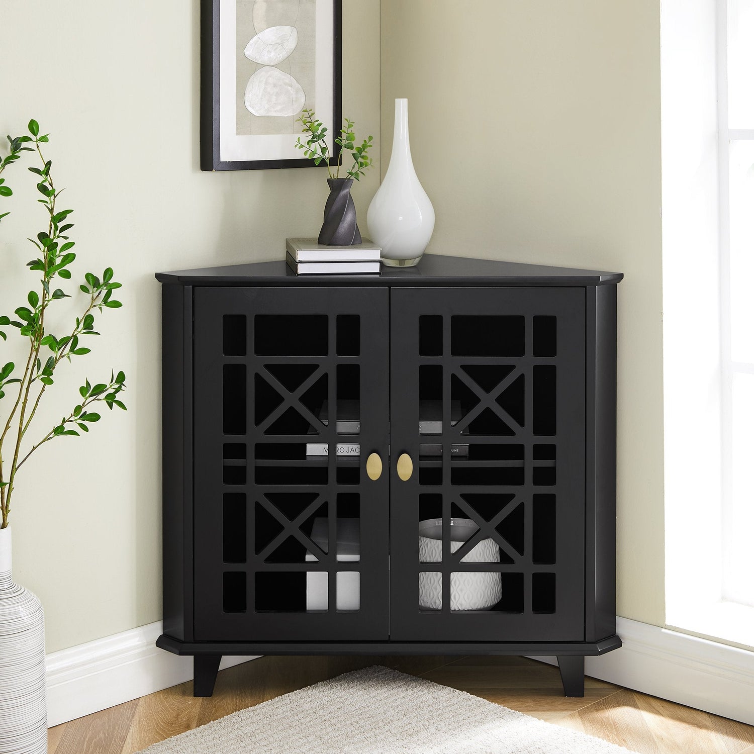 Don’t fret about what you’ll display in that empty corner of your living room, bedroom, or home office. The unique fretwork of this gorgeous piece will be the crowning glory where the walls meet in your home, and can easily spice up your space as a corner accent table or stylish bar cabinet. This transitional piece boasts delicate painted steel handles that complement the table’s understated minimalism, while the intricate cutouts on the front lend a subtle nod to contemporary global design. Furnish the corner accent table with a decorative array of tasteful décor, or use it to store your family’s favorite board games, storybooks, or DVD collection that you can hide behind the two soft-close doors.