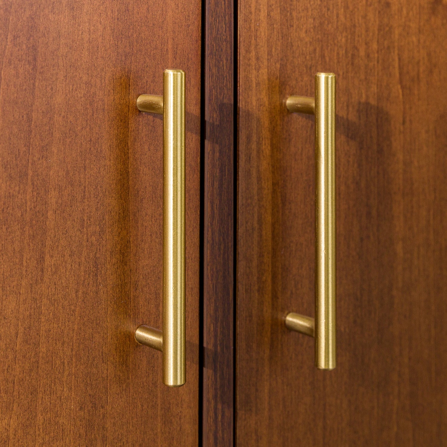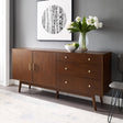 Stage this stunning wood veneer unit as a kitchen buffet, office credenza, or living room sideboard. Its modern silhouette lets it fit any trending style of your choosing. Two adjustable shelves are available for you to organize however you like. Three drawers run on telescoping metal glides for smooth movement and tapered legs give it such an oh-so boho-chic silhouette. Place it in your dining room, living room, bedroom, or anywhere you need closed storage capabilities. Your home will be cleaner and more stylish in no time!