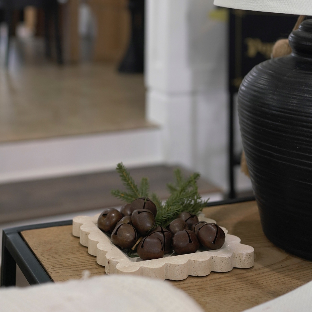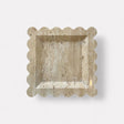 Introducing the Penelope scalloped edge tray in beige travertine, a stunning addition to any interior. Crafted with a square shape, this tray boasts a thick, scalloped edging detail around the perimeter, lending an elegant and organic feel to any space. The natural texture and earthy tones of the travertine also add a touch of sophistication to the overall design.