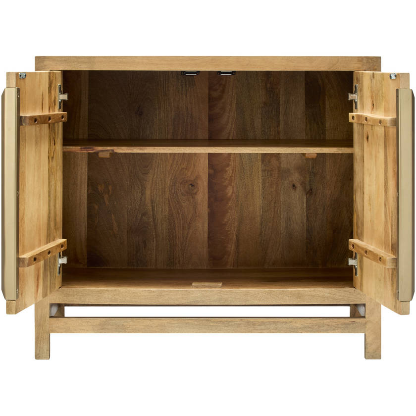 Constructed with solid mango wood and engineered for long-term use, the Stephenie Cabinet is a sturdy investment for your home. The powder-coated brass-toned steel top adds a durable, easy-to-clean surface ideal for displaying decor, lamps, or vases. Soft-close hinges help protect the doors from wear and tear, ensuring this piece remains a timeless part of your home for years to come.