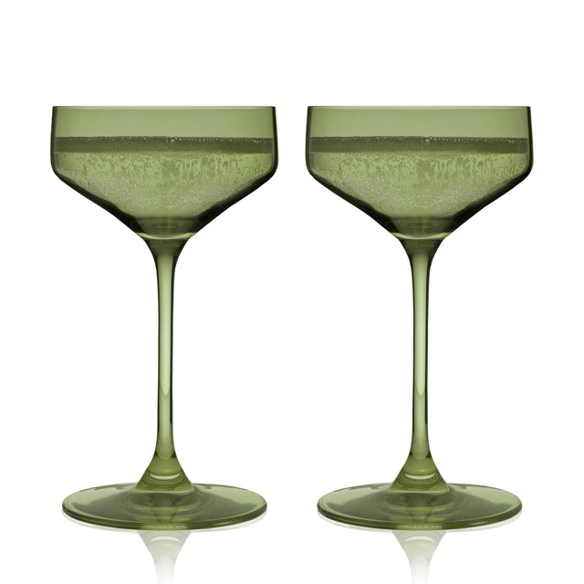 Crafted from European crystal with a gorgeous sage green hue, these coupe glasses bring a soft, lush tint to shaken cocktails. Add some color to your glassware collection with these stemmed cocktail glasses.