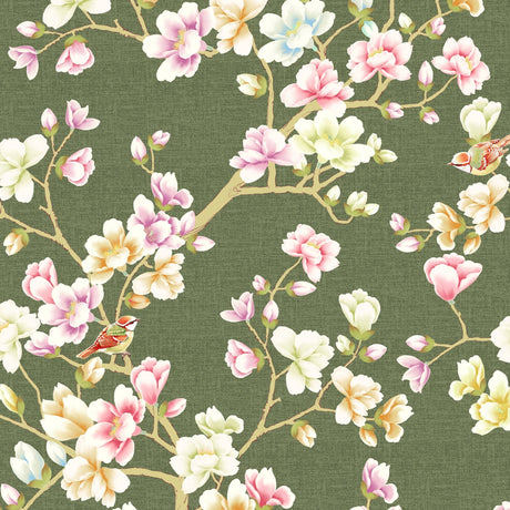 Green Vintage Floral Chinoiserie Wallpaper - Magnolia Flowers Wall Mural