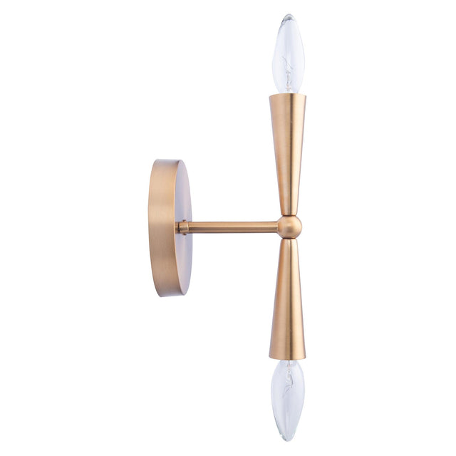 This fun mid-century modern wall light features 2-lights in a gold finish. It is the perfect statement piece to add a youthful touch to any room in you're home. The sleek lines and warm glow of the lights make it the ideal addition to any modern interior design.