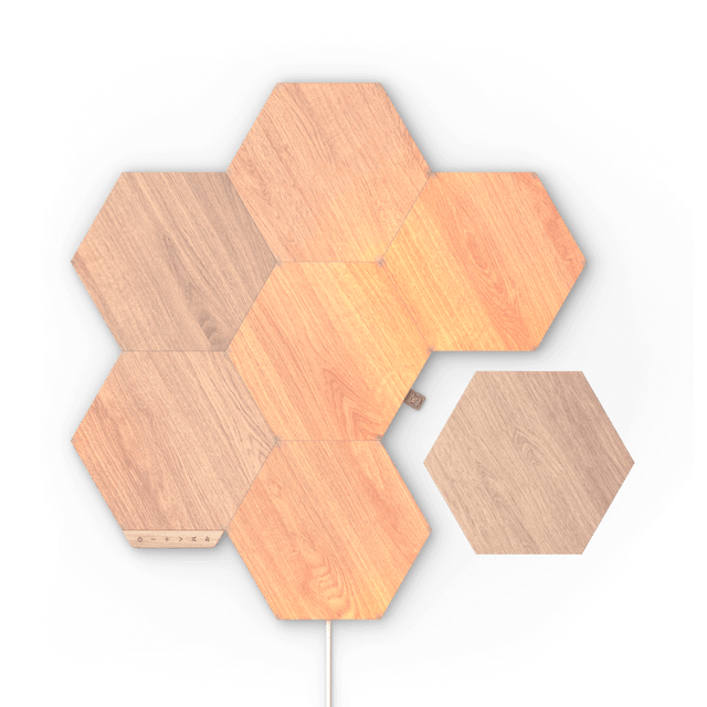 Nanoleaf Elements Hexagons Smarter Kit come with everything you need to create your own unique lighting designs. Enjoy the sophisticated wood grain veneer while off, or turn them on to illuminate your space with a dynamic glow. Install in your living room, bedroom, entryway, or any space where you want to add an elegant and organic feel to your home. Install on any flat surface with included adhesive Mounting Tape; no additional tools required. Compatible with all Connect+ products like Shapes Triangles, Hexagons, and Mini Triangles.