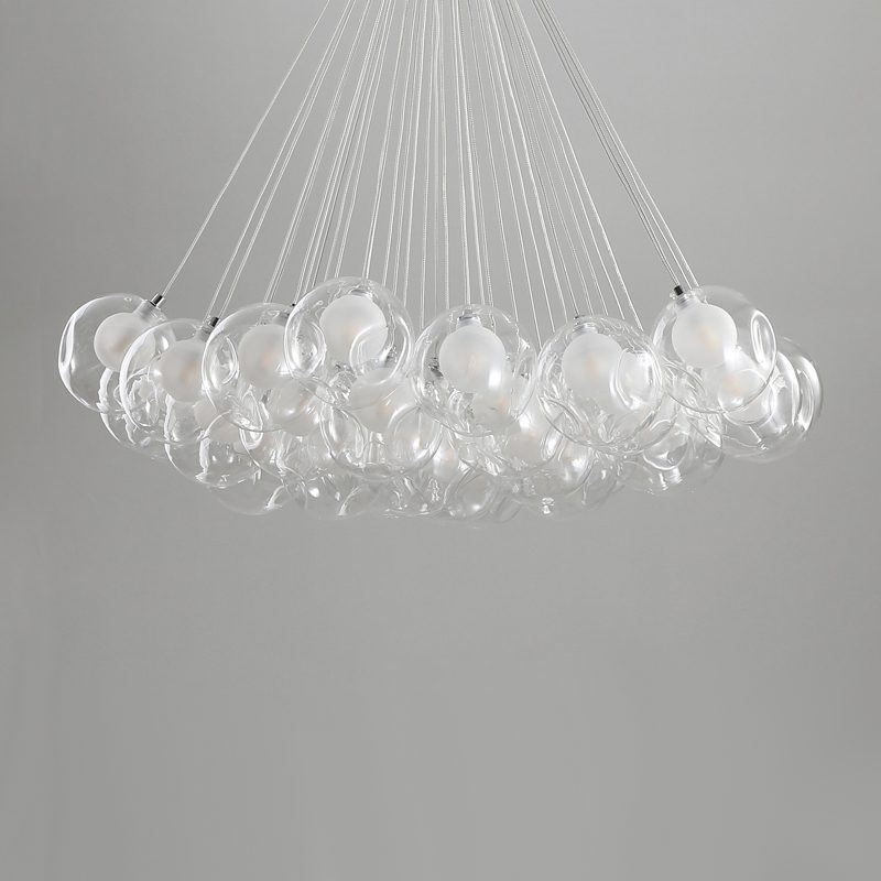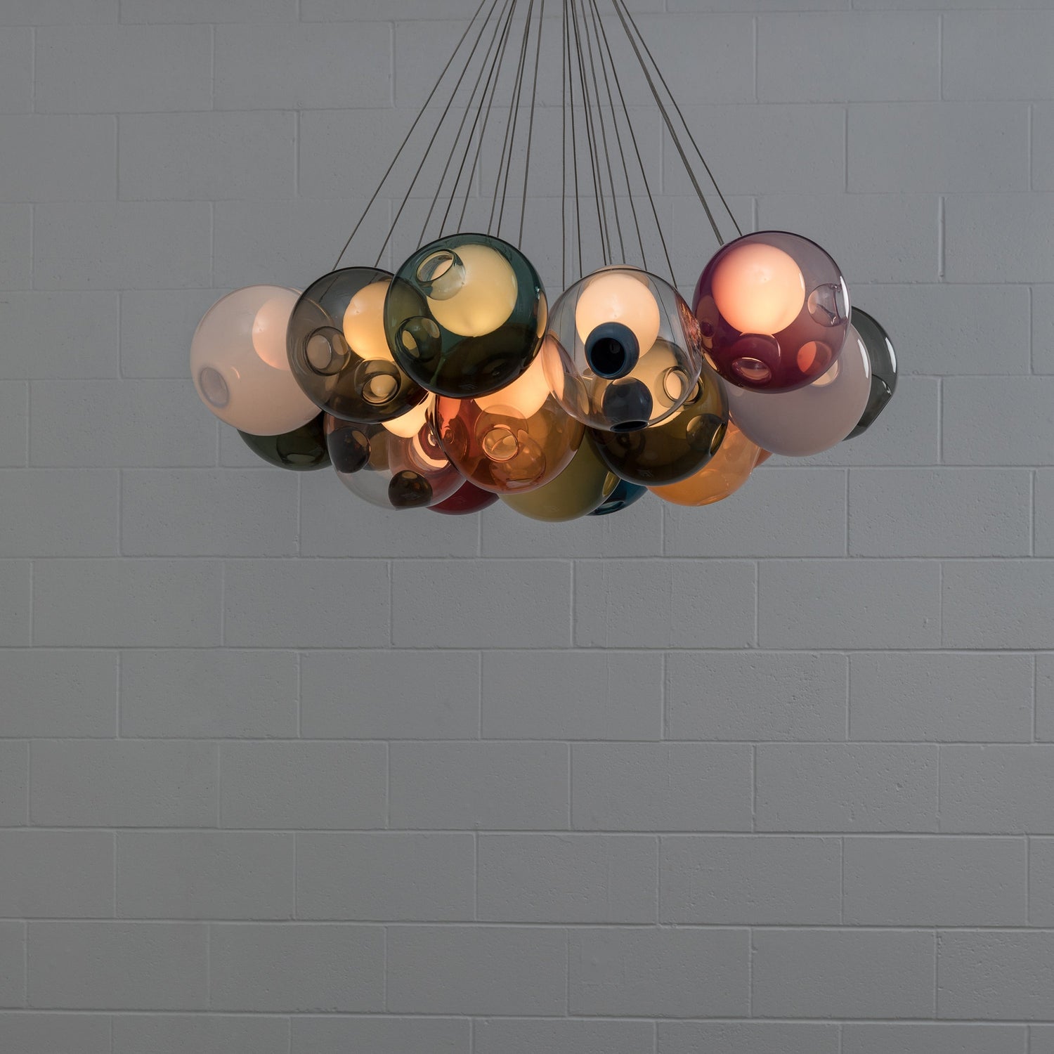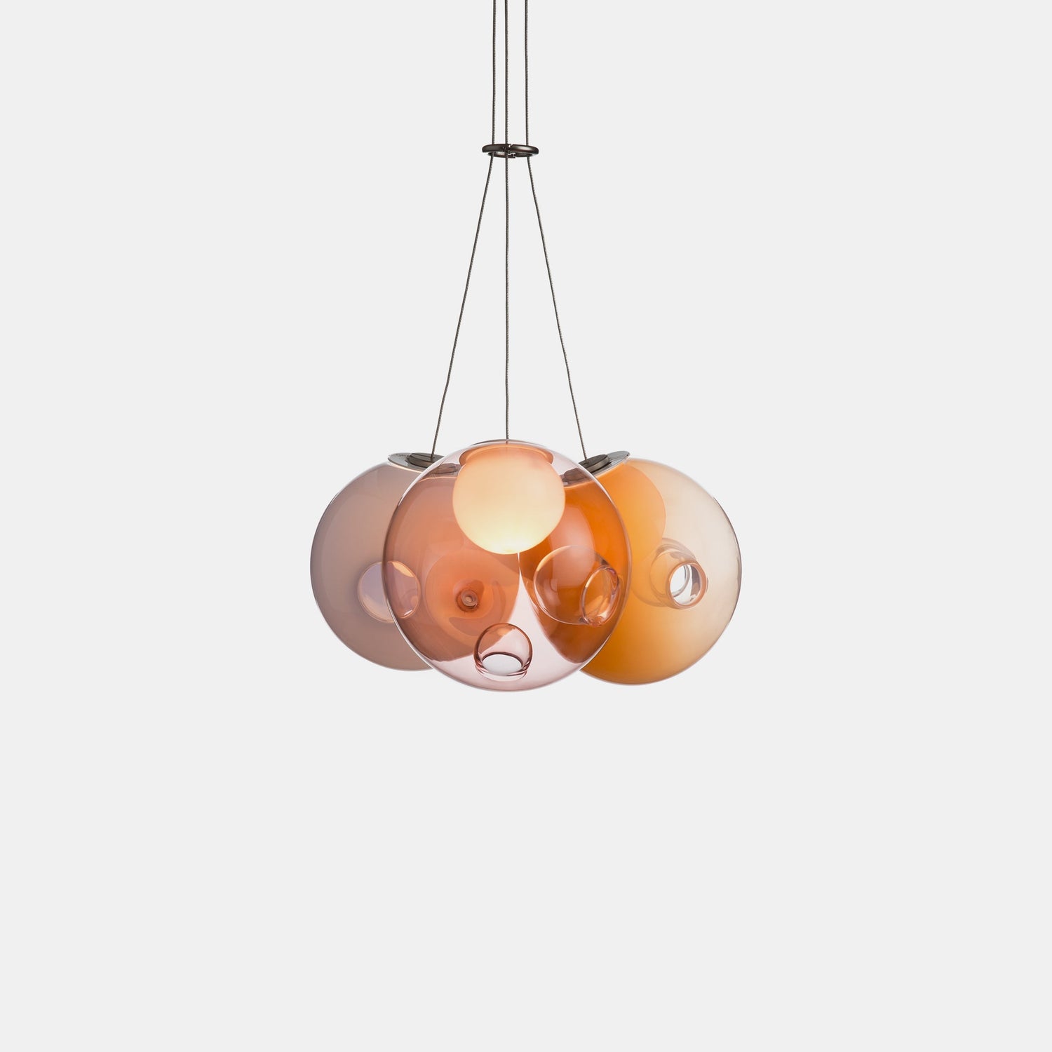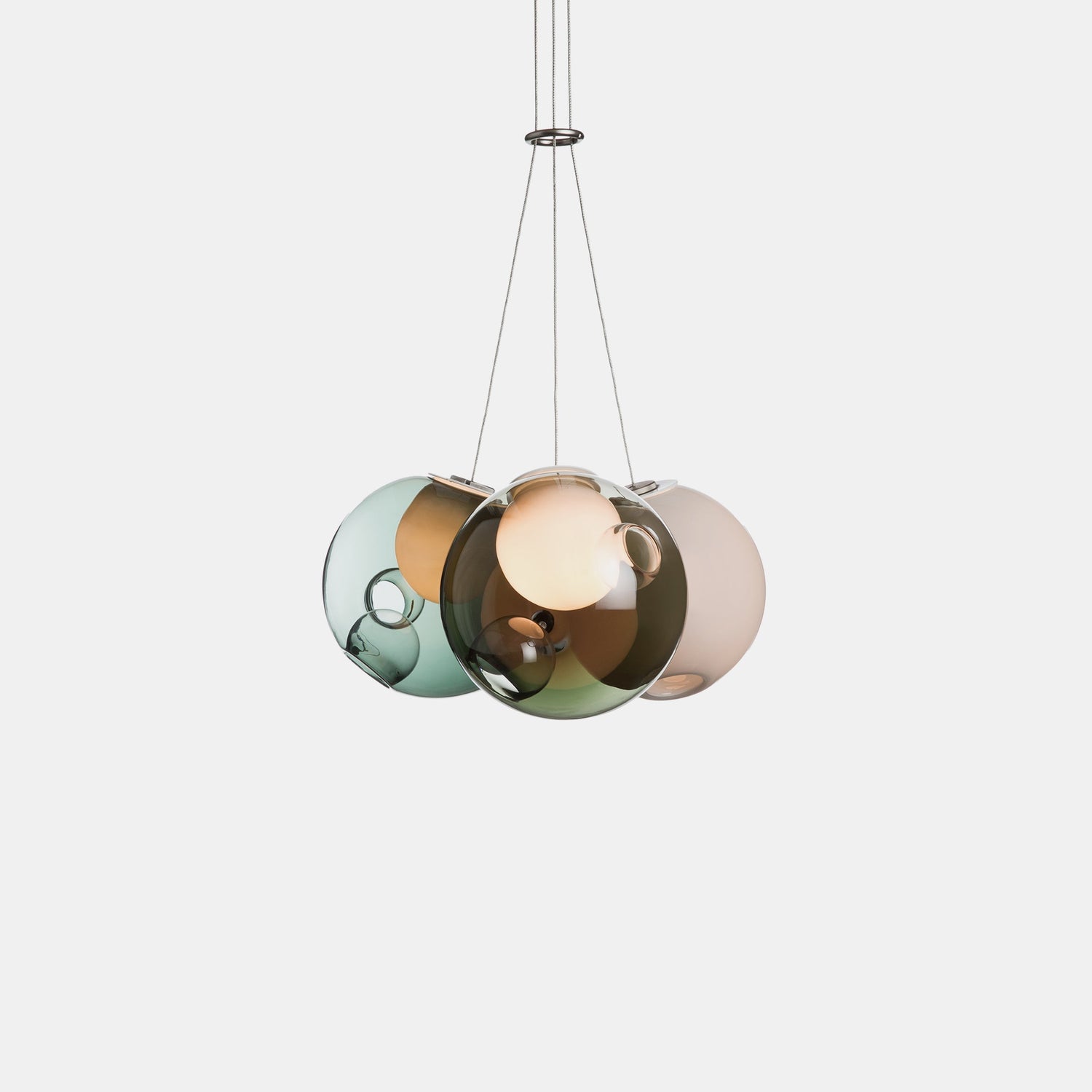 28 Series Cluster Pendant Lights by Omer Arbel for Bocci result from an innovative fabrication process that manipulates both the temperature and the direction of airflow into blown glass. The result is a slightly distorted sphere with an interior landscape of satellite shapes, including an opaque milk glass diffuser that houses either a low-voltage xenon or LED lamp. The pendants hang in the shape of a hexagonal bouquet, bundled together by an adjustable ring, which changes the curvature of the piece and its proportional reading.