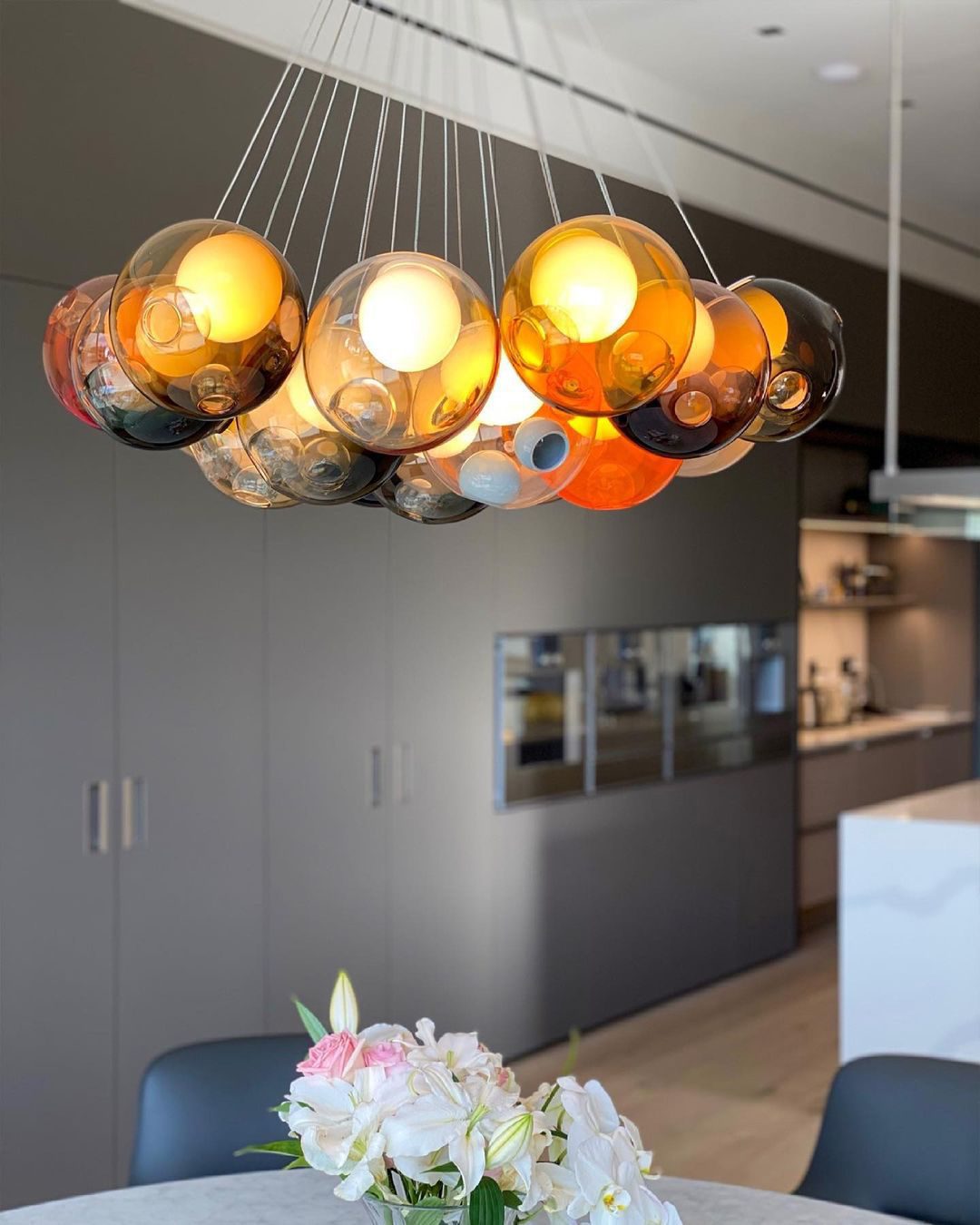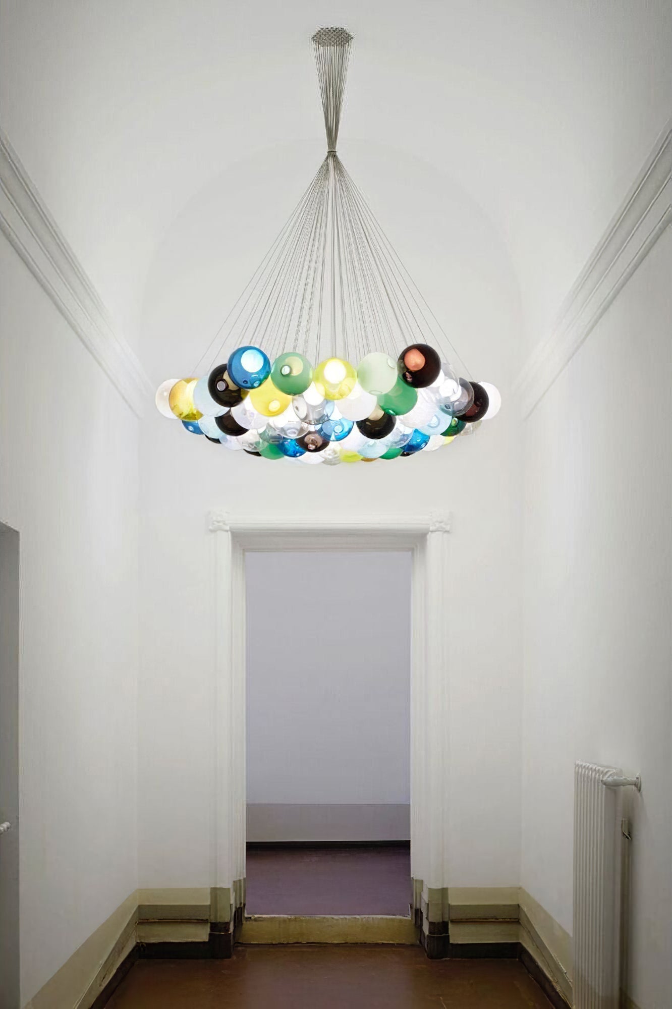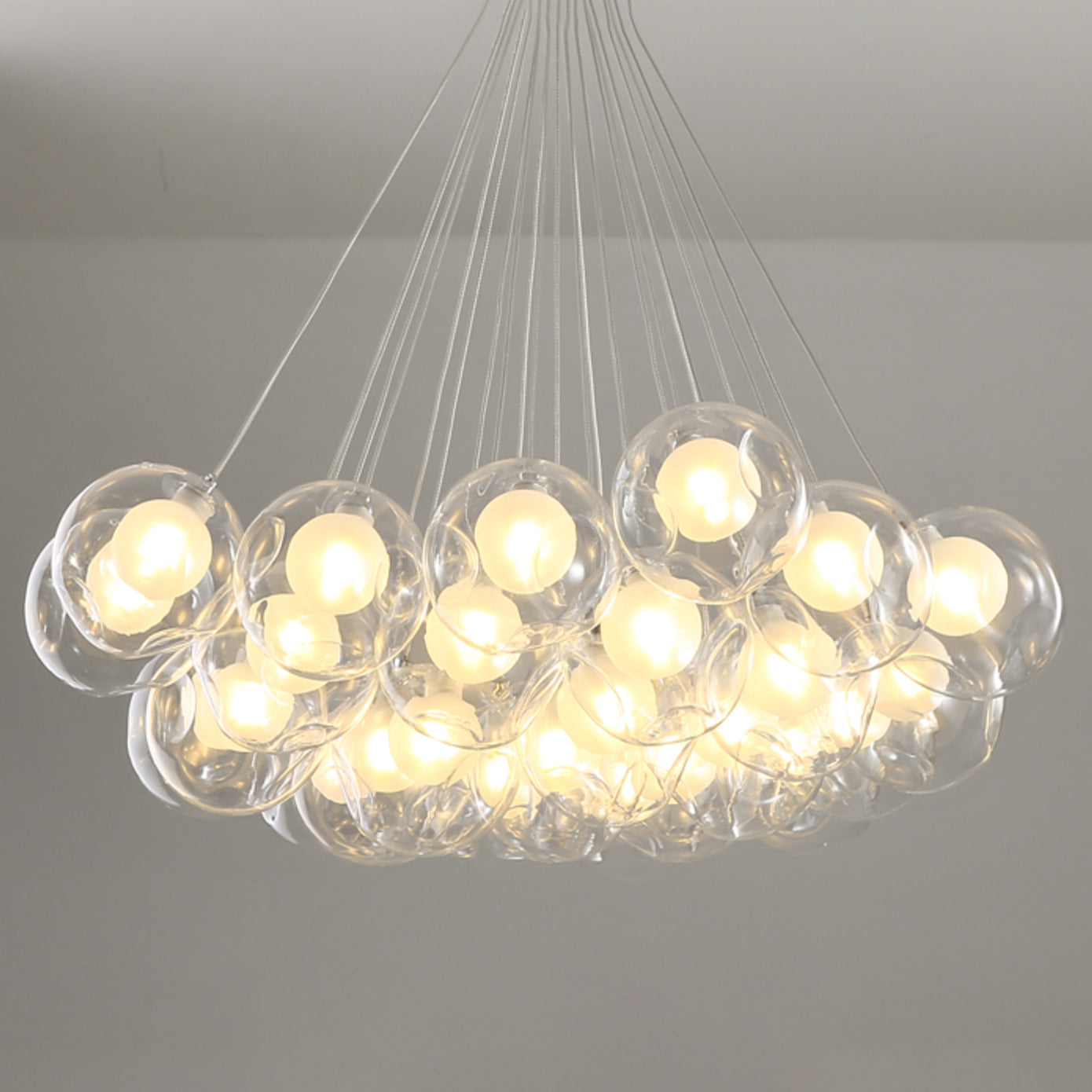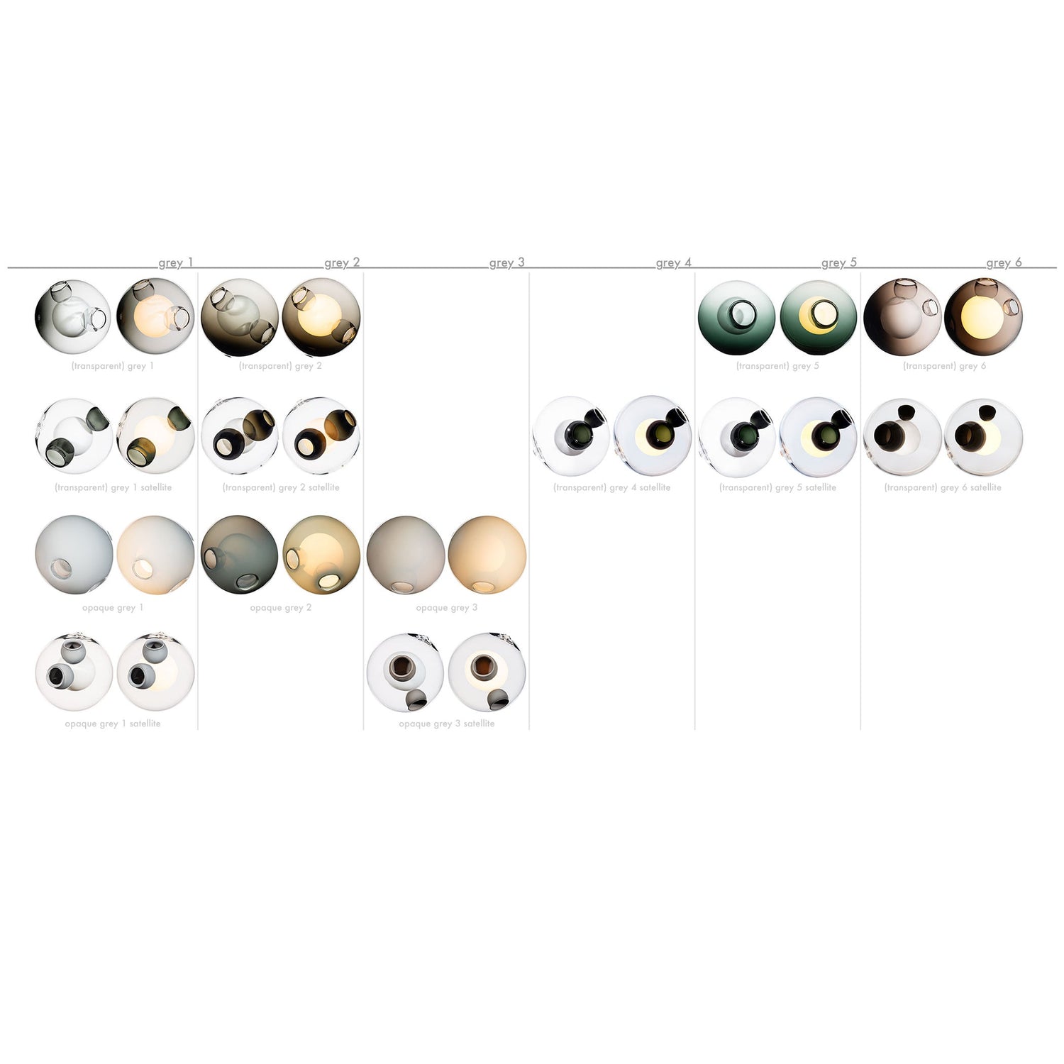 28 Series Cluster Pendant Lights by Omer Arbel for Bocci result from an innovative fabrication process that manipulates both the temperature and the direction of airflow into blown glass. The result is a slightly distorted sphere with an interior landscape of satellite shapes, including an opaque milk glass diffuser that houses either a low-voltage xenon or LED lamp. The pendants hang in the shape of a hexagonal bouquet, bundled together by an adjustable ring, which changes the curvature of the piece and its proportional reading.