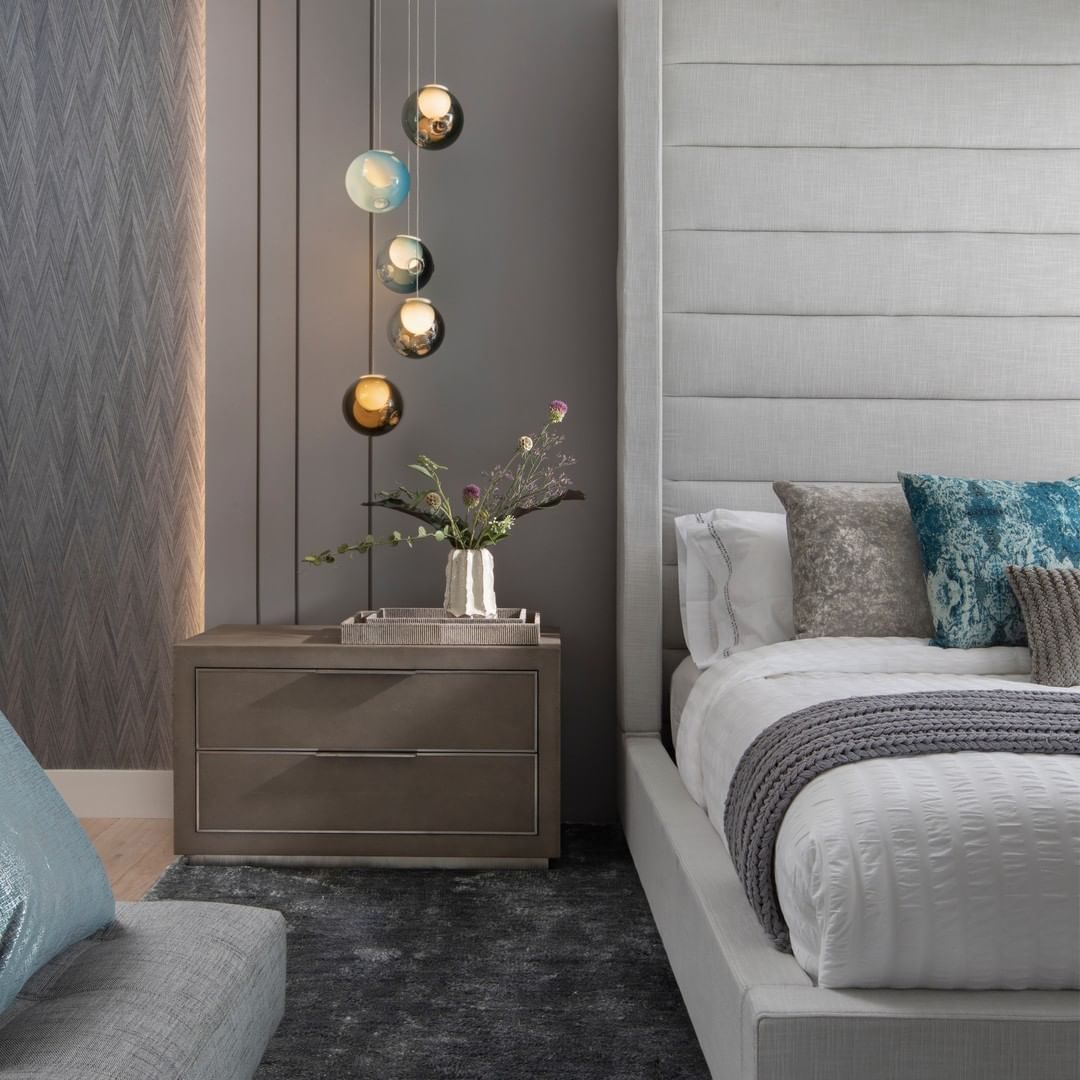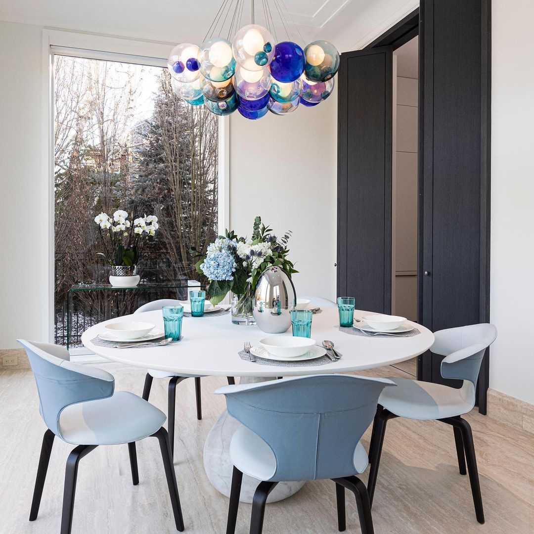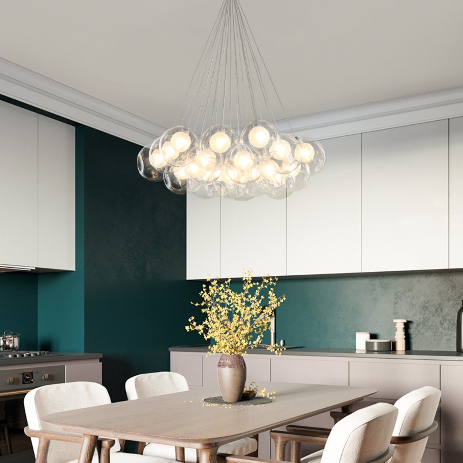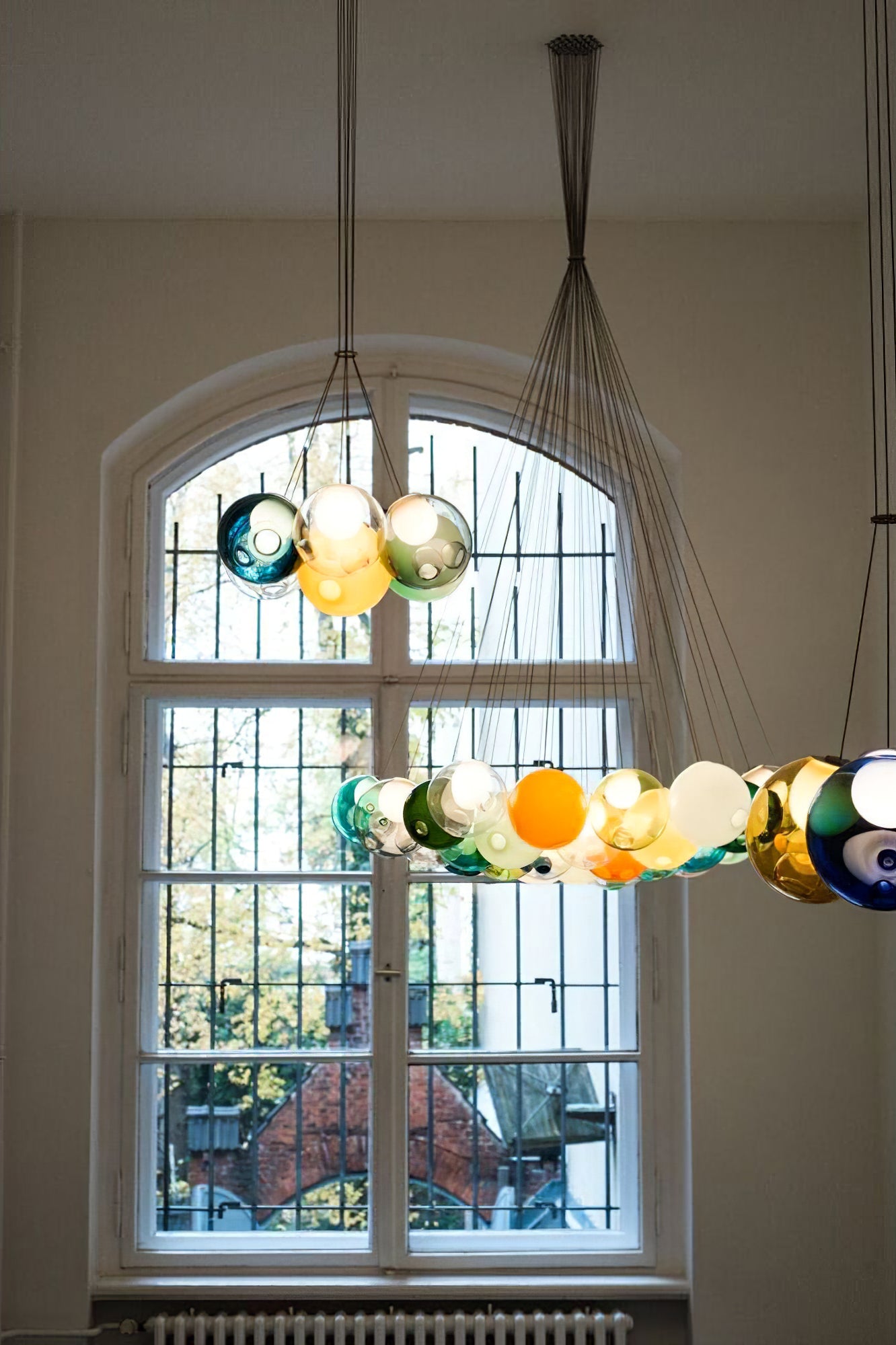 28 Series Cluster Pendant Lights by Omer Arbel for Bocci result from an innovative fabrication process that manipulates both the temperature and the direction of airflow into blown glass. The result is a slightly distorted sphere with an interior landscape of satellite shapes, including an opaque milk glass diffuser that houses either a low-voltage xenon or LED lamp. The pendants hang in the shape of a hexagonal bouquet, bundled together by an adjustable ring, which changes the curvature of the piece and its proportional reading.