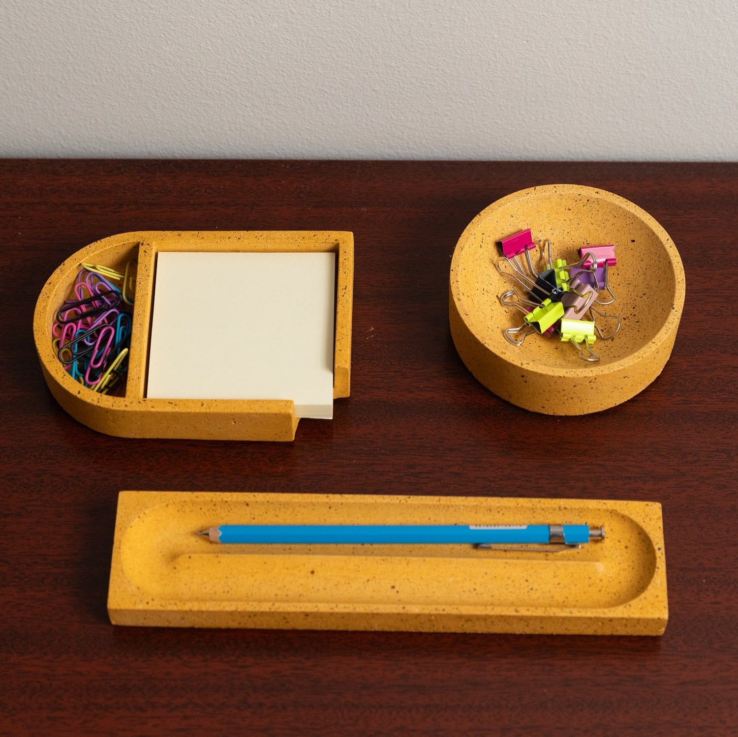 For the tiny desktop items like paper clips and tacks. These beautiful concrete vessels will keep your desk looking so fresh and so clean.