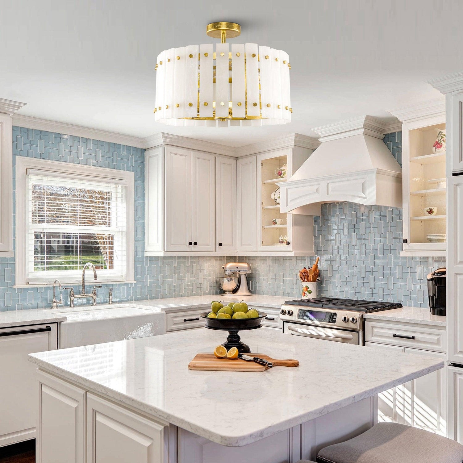 Illuminate your space with the sleek and modern design of the 4-Light Modern Drum Marble Semi Flush Mount Ceiling Light. This unique light fixture features a stunning marble drum shade, a semi-flush mount design, and four lights that offer a warm and inviting glow. The marble drum shade adds a touch of elegance and sophistication to this contemporary light fixture. It has a beautiful natural pattern that complements any decor style, making it a versatile addition to your home. The semi-flush mount design allows for a low-profile installation, perfect for rooms with low ceilings or spaces where a lower hanging light would be intrusive.