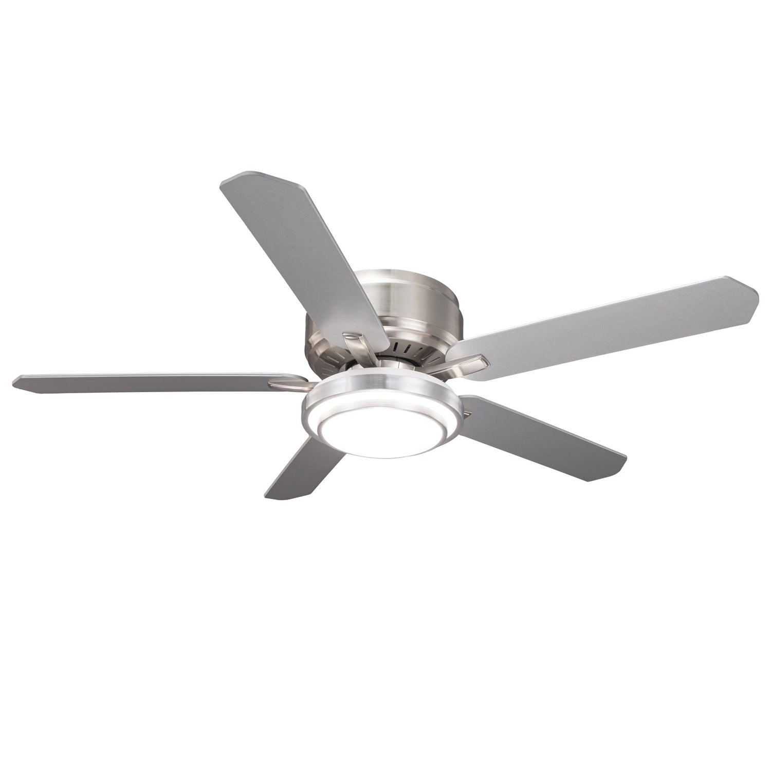 【Dual-Sided Industrial DesignFeatures a 52-inch flush-mount profile with five reversible blades, offering a silver or wood-grain finish to match any industrial or modern decor.