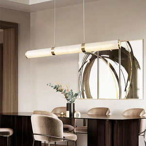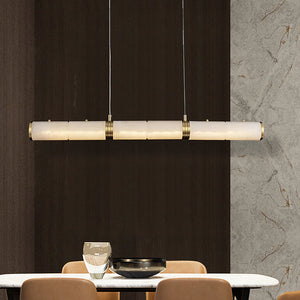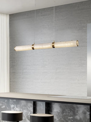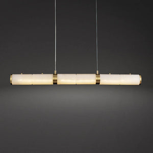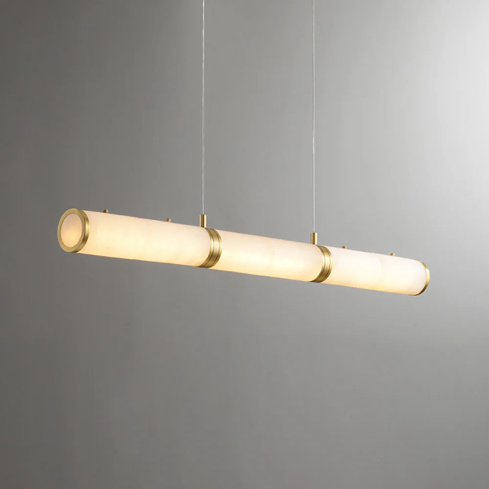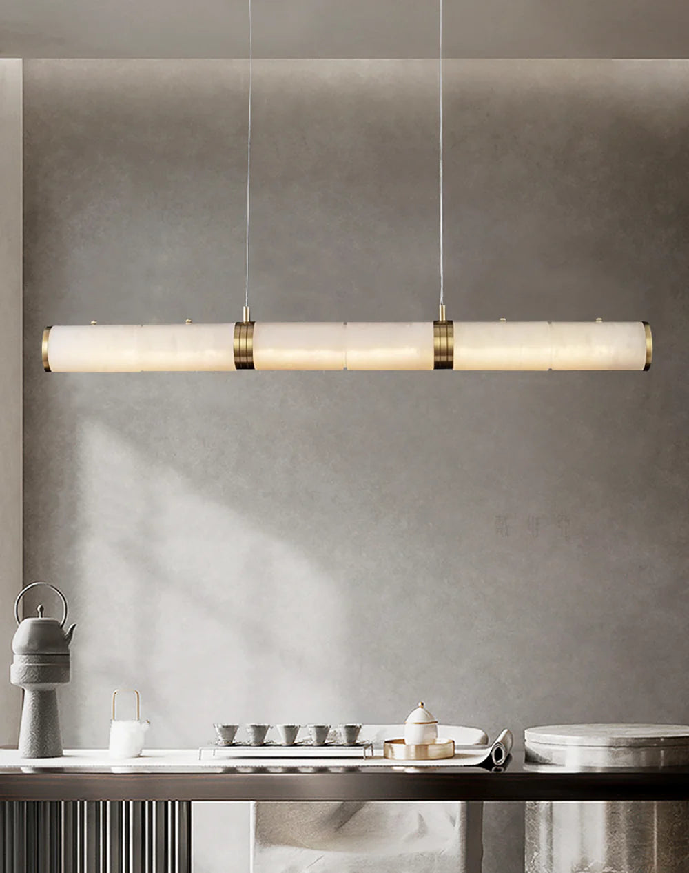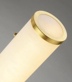 Add a touch of refined elegance to any space with our Alabaster Cylindrical Chandelier. The milky white hue of alabaster is perfectly complemented by a warm, golden glow, highlighting its natural beauty. With minimalist design and a floating appearance, this chandelier is perfect for modern interiors.