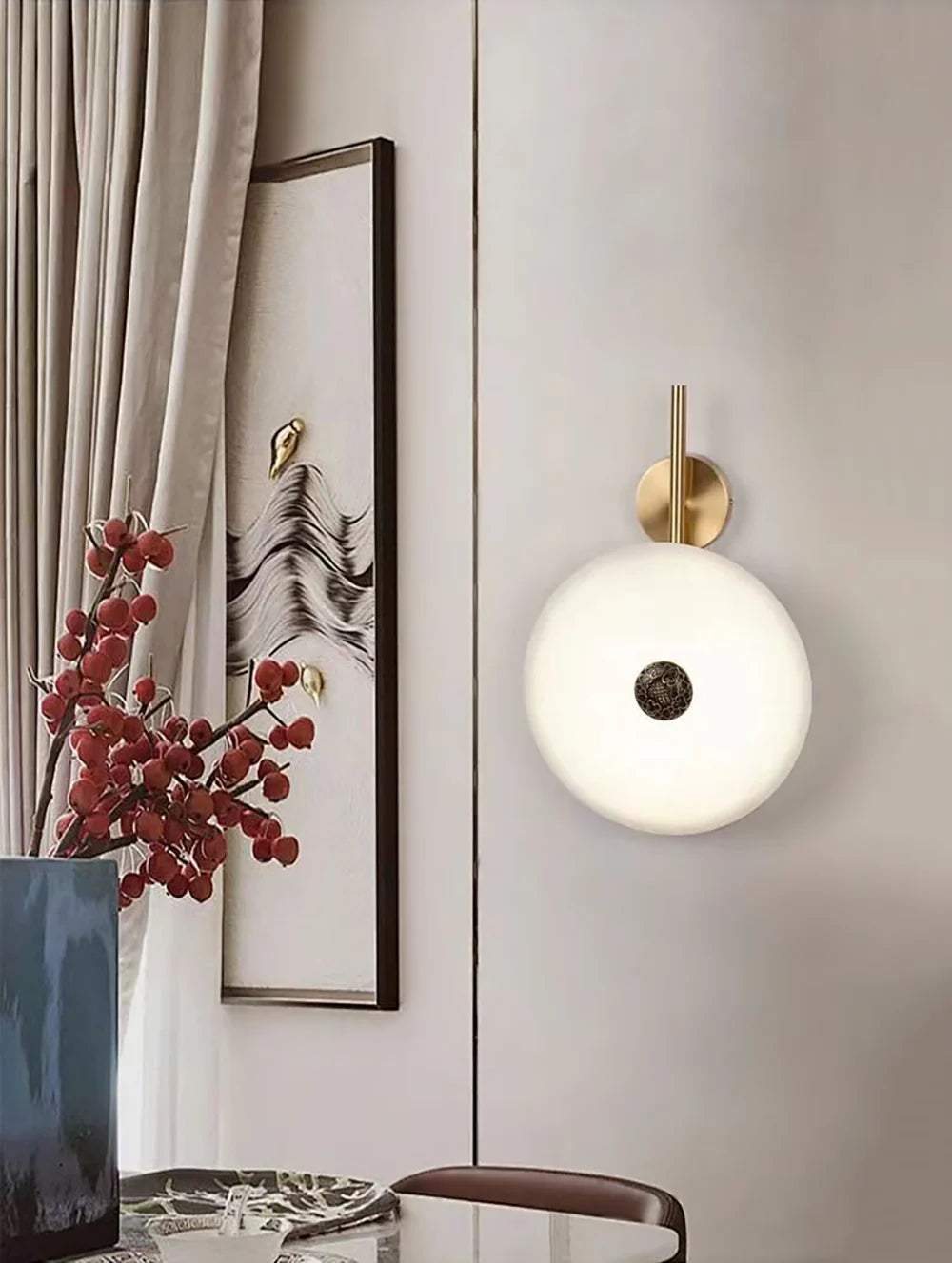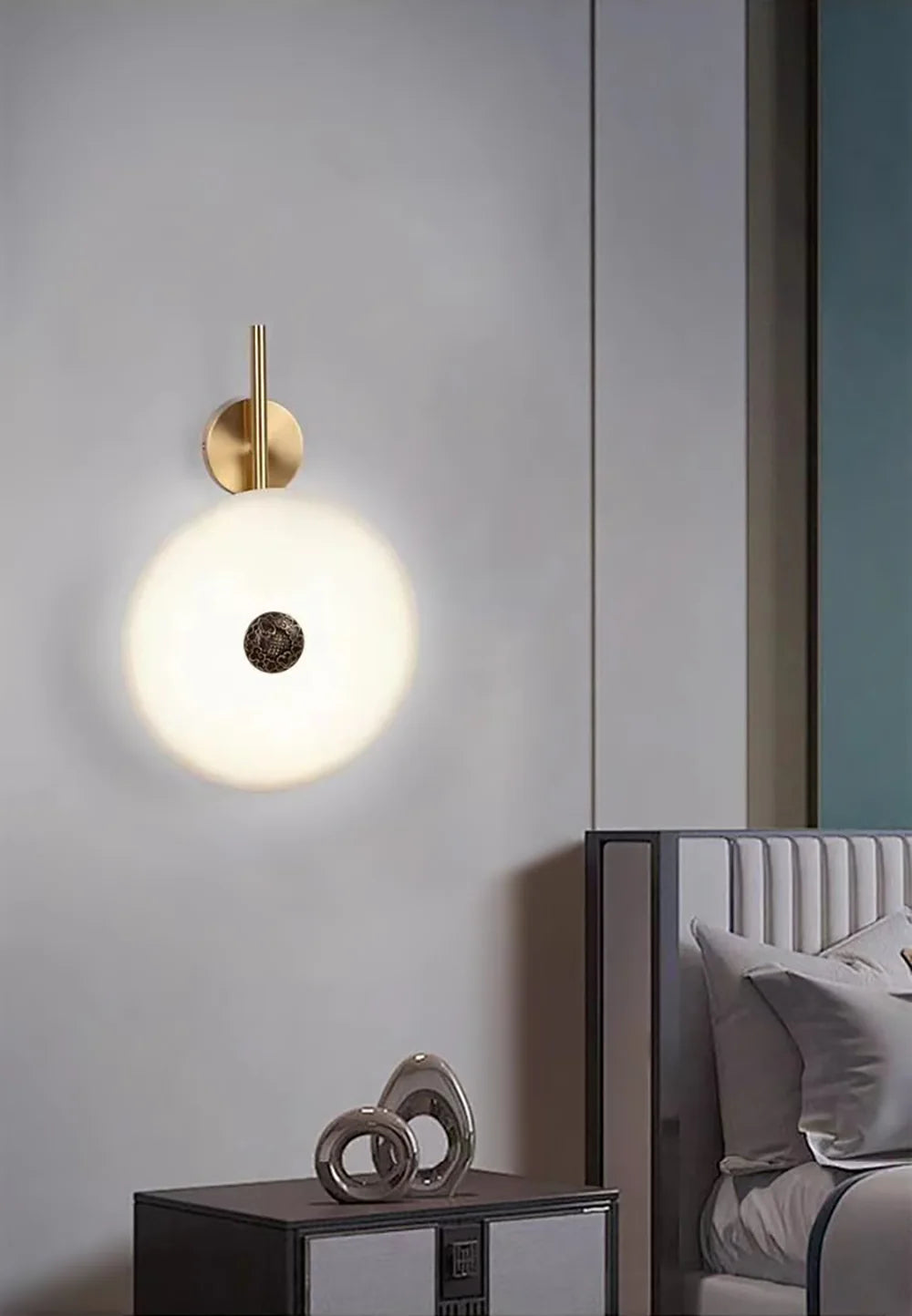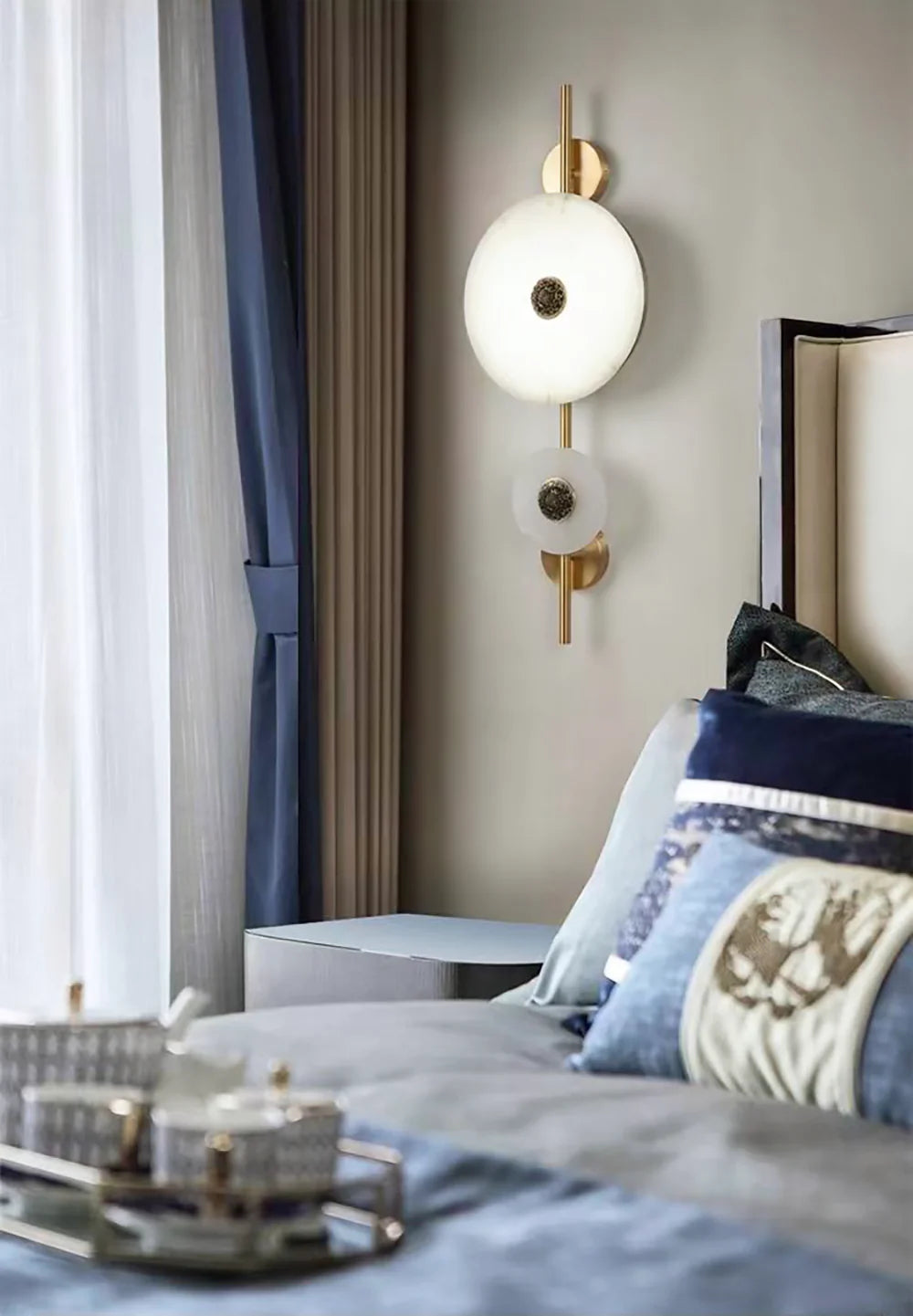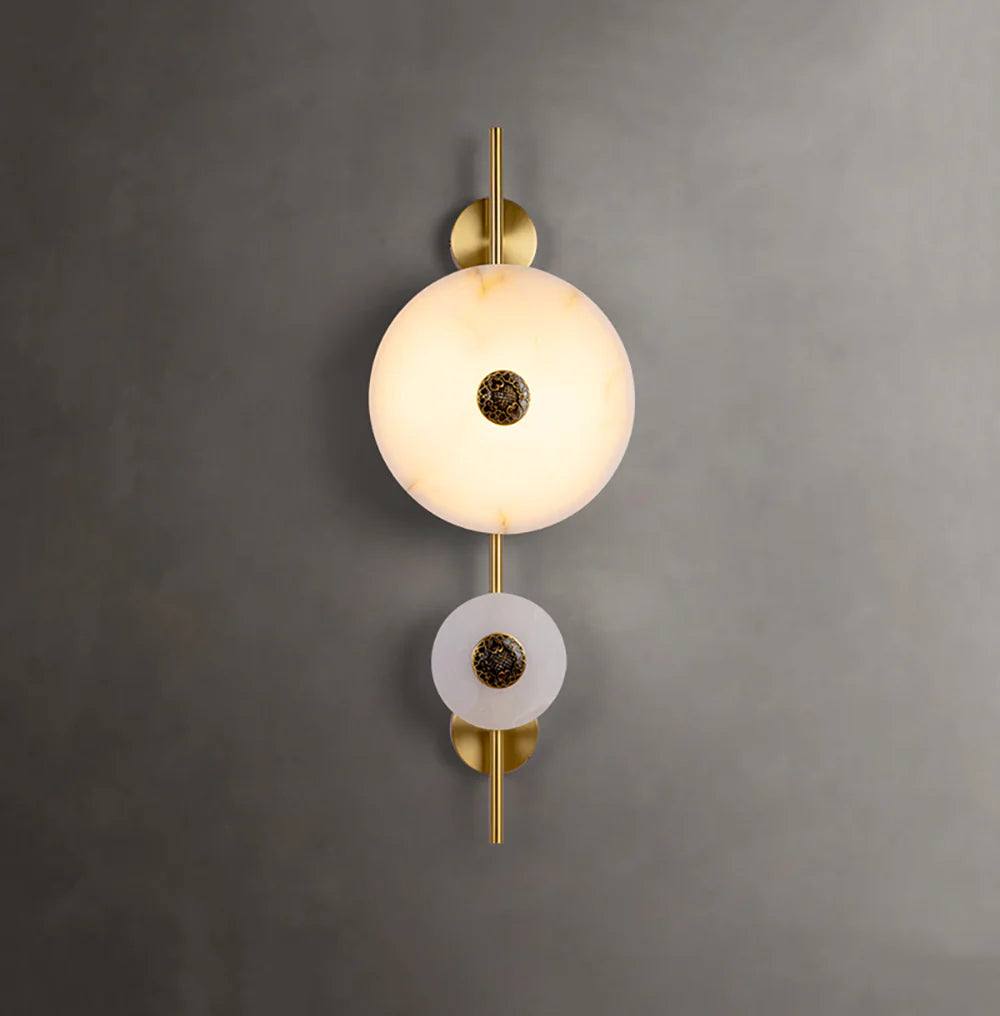 Experience the captivating beauty of nature and modern design with the Alabaster Eclipse Wall Light. Its luminous alabaster stone discs emit a warm and welcoming glow, capturing the subtle sophistication of an eclipse. The brass accents and organic texture of the stone create a striking contrast, adding timeless luxury to any contemporary or classic interior. Make a statement in your living room, hallway, or bedroom with this masterpiece of natural and modern elegance.