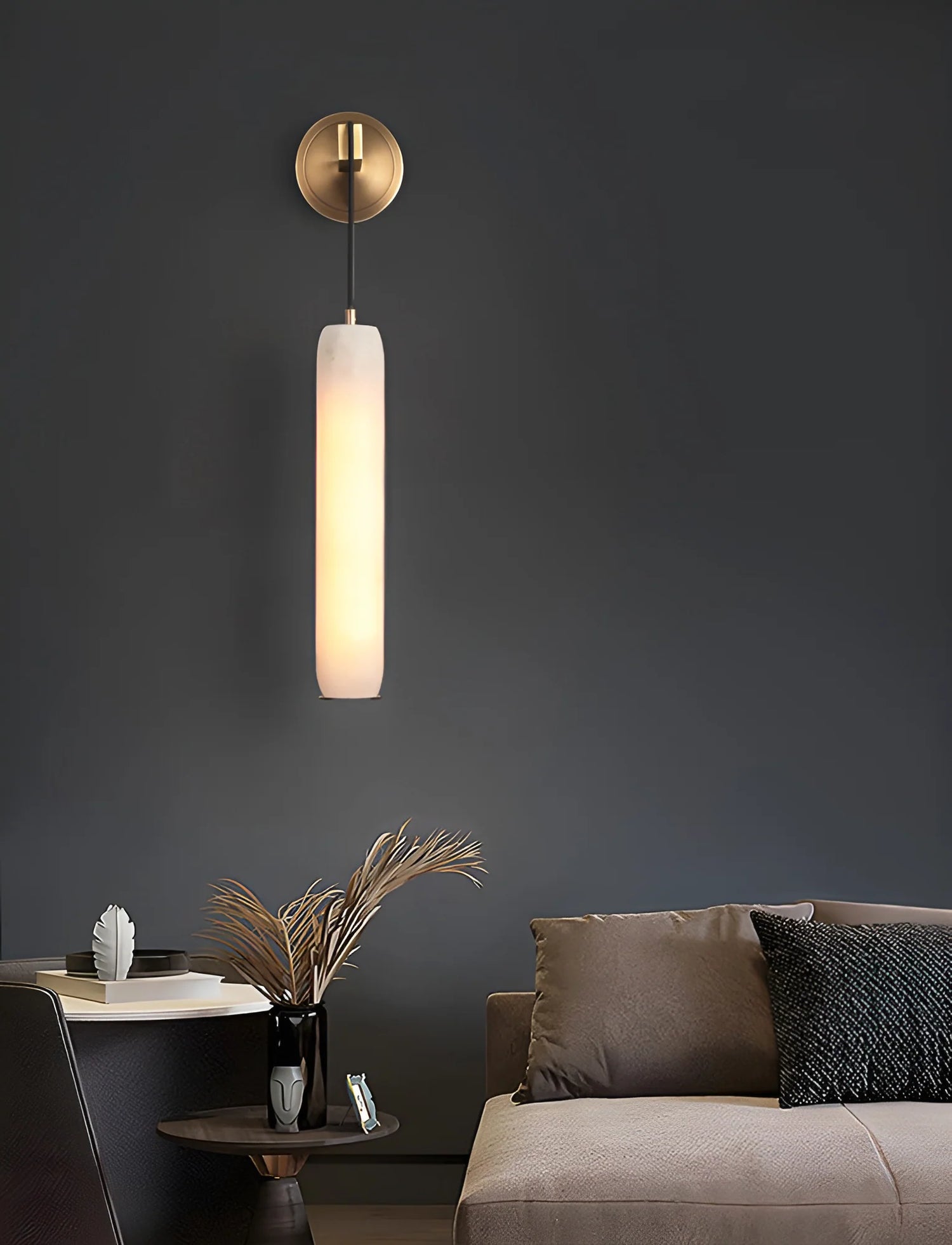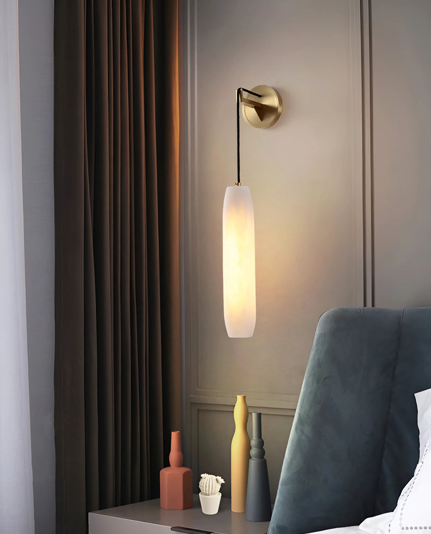 The natural veining in the alabaster softly diffuses light, casting a warm and calming glow that enhances the atmosphere of any room. Whether installed in a hallway, beside the bed, or in a cozy reading corner, this pendant wall lamp delivers both functional lighting and visual elegance.