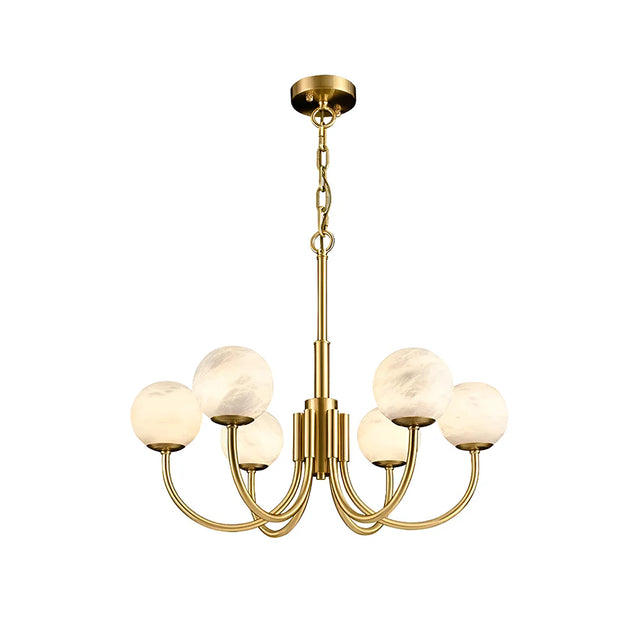 Our Alabaster Modern Brass Chandelier makes a beautiful statement in any dining room, entryway, or above a kitchen island. Featuring elegantly curved arms paired with modern globe shades, is crafted from solid brass and casts a warm glow. cloches and spheres of blown glass are suspended from metal frames in perfect equipoise. Blurring the line between lighting and sculpture, each piece acts as a radiant focal point and a potent symbol of balance.