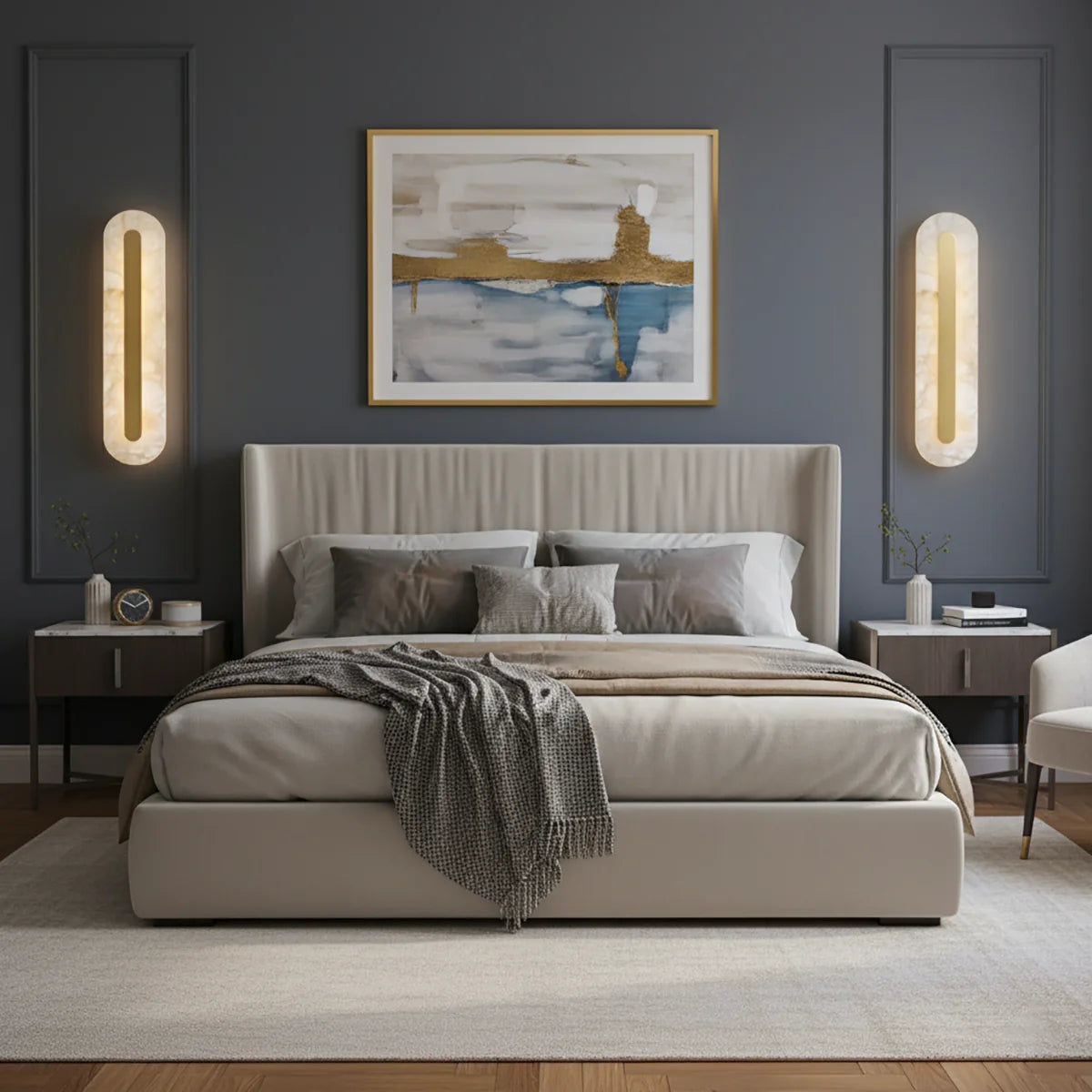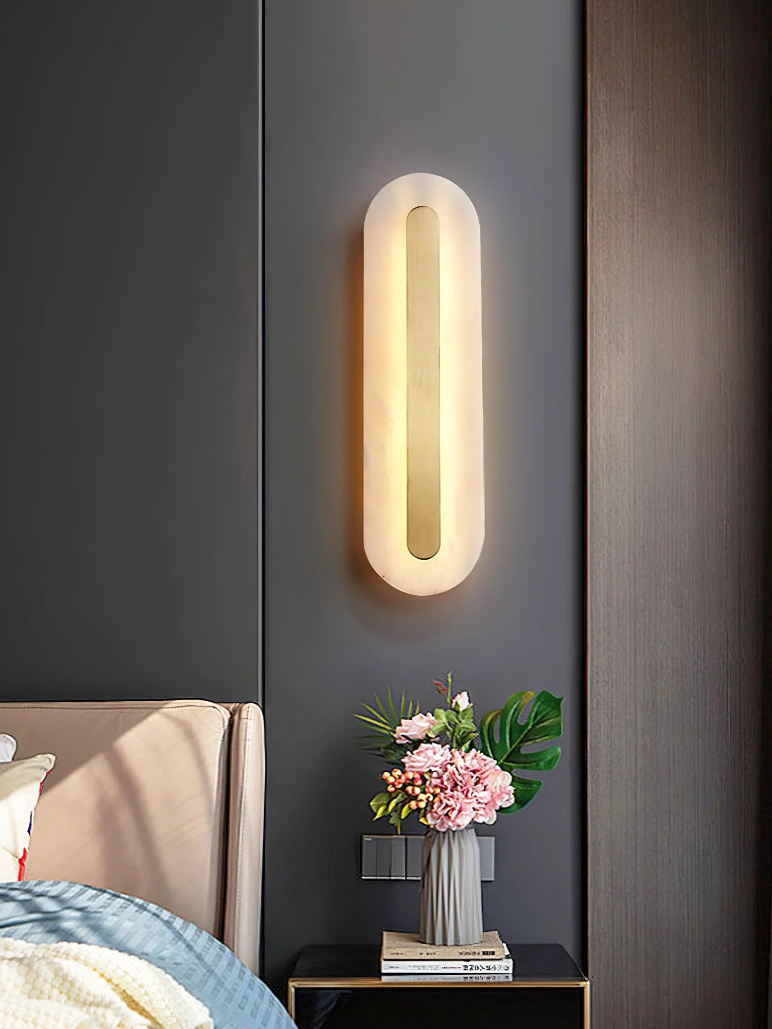 Elevate your ambiance with the understated charm of the Alabaster Gold Oval Wall Light. Carved from natural alabaster and framed with a sleek golden accent, this minimalist sconce radiates a warm, soothing glow—perfect for crafting a peaceful retreat in any room. Whether mounted vertically or horizontally, its versatile oval silhouette adds both function and refined beauty to your walls.