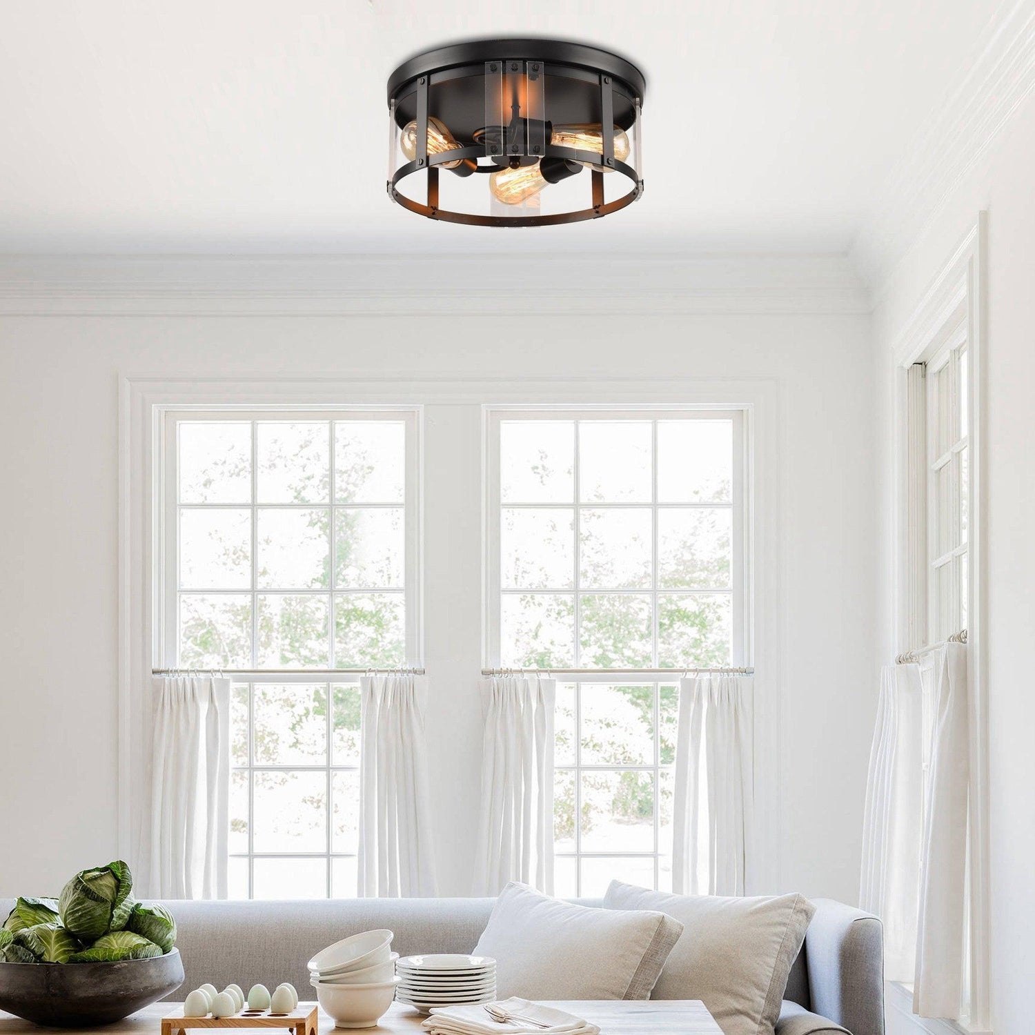 We love simplicity just like you do. Black adds a rustic farmhouse style to any space and gives it a stylish vibe. This Three Bulb Ceiling Flush Mount is a stylish, vintage lighting fixture that is the perfect finishing touch you've been looking for to fit on your ceilings, such as your dining room, hallway, or foyer. A drum-style lamp shade that comes in an antique black finish, this retro piece measures 150mm. Dia and 340mm height. The open design features a larger frame in a black finish and transparent acrylic pieces to add more details, which completes the look. Vintage-style Edison bulbs are recommended for this farmhouse-industrial style fixture which is an ideal selection for hallway, entryway, stairway, doorway, closet, pantry, kitchen, sitting room, covered porch, or foyer to bring warmth to a living room or bedroom.