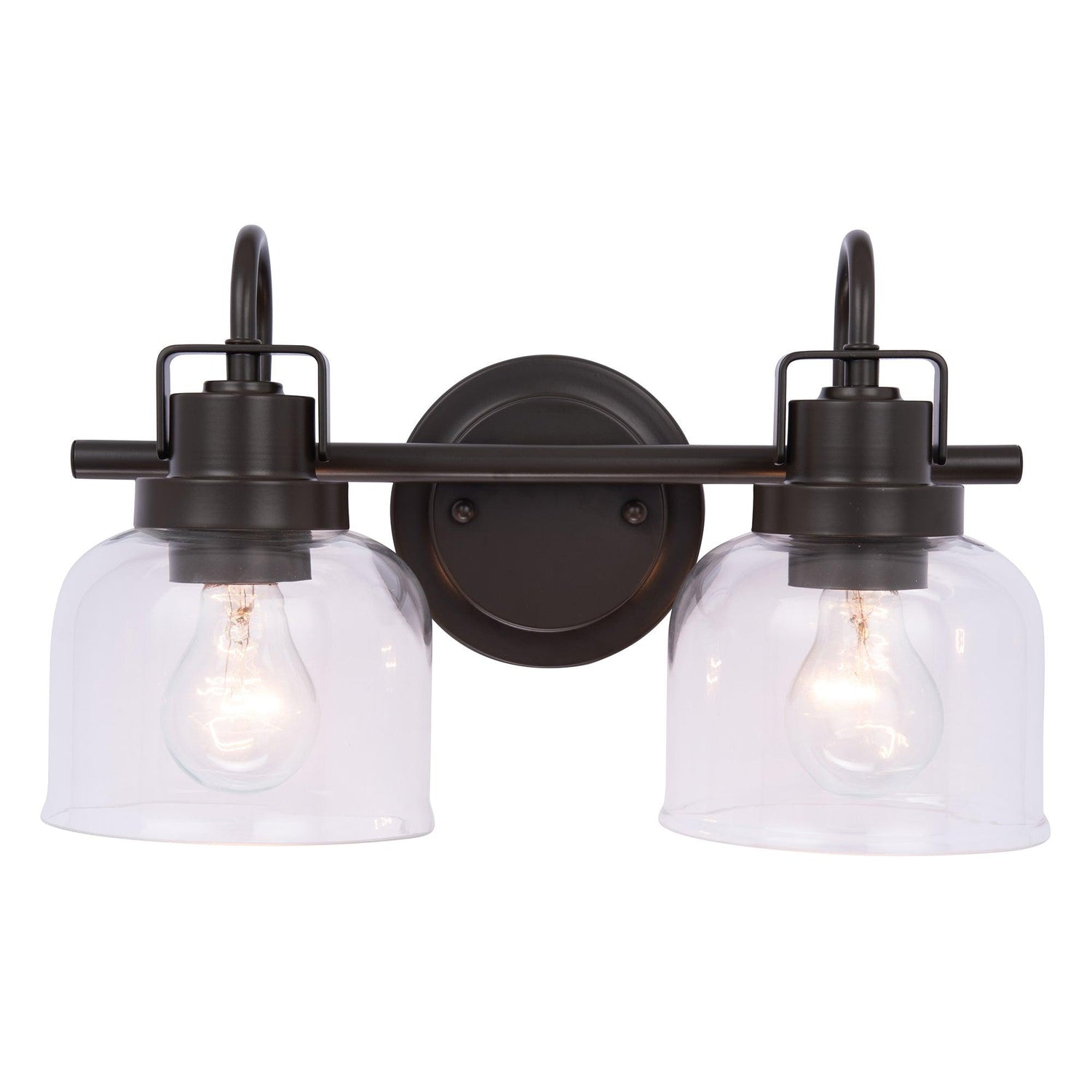 Dark Bronze, 2-light vanity light displays a modern farm house look for the vanity. The backplate connects to one sleek arm that can easily be mounted up or down thanks to its reversible feature. Two clear glass cups enclose two medium-base bulbs up to 60W, which is not included. This vanity light is compatible with a dimmer switch (not included), so you can adjust the lighting to match what the room requires.
