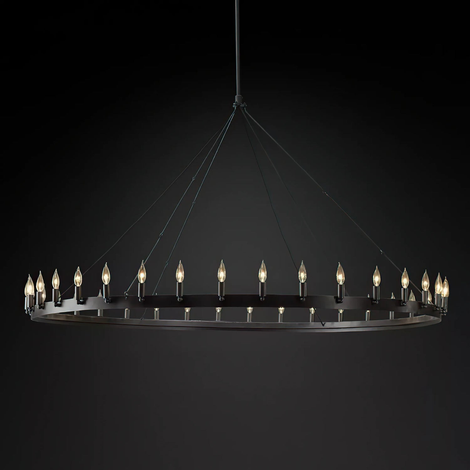 Drawing inspiration from early 20th-century industrial aesthetics, the Camino Vintage Candelabra Round Chandelier 73" embodies rustic allure, marrying sleek simplicity with grand dimensions. Crafted meticulously from resilient angle iron, it emanates an enduring charm evocative of a nostalgic era.