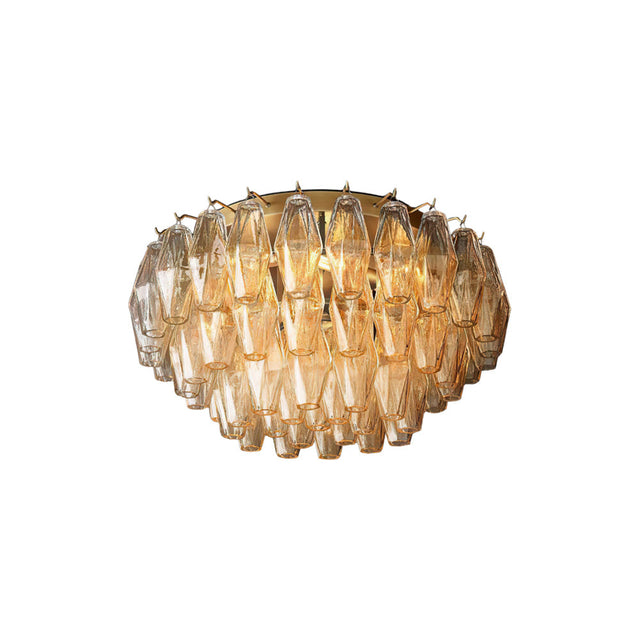 The Chara Glass Flushmount 22" showcases hand-blown glass polyhedra on a tiered steel frame. Radiantly illuminated, these facets reflect and refract light, paying homage to 1950s Italian lighting in a sleek minimalist design.