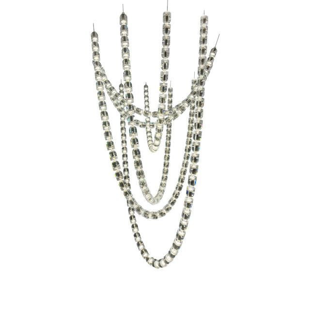 Introducing Ebuylight's Gabriel Chandelier G. Inspired by the graceful movements of a snake, this fixture features a V-shaped pendant of interconnected threads, creating a captivating cascade of light and depth. The perfect blend of organic influence and modern design, it adds a touch of drama to any room with its hypnotic elegance and tranquil ambiance.