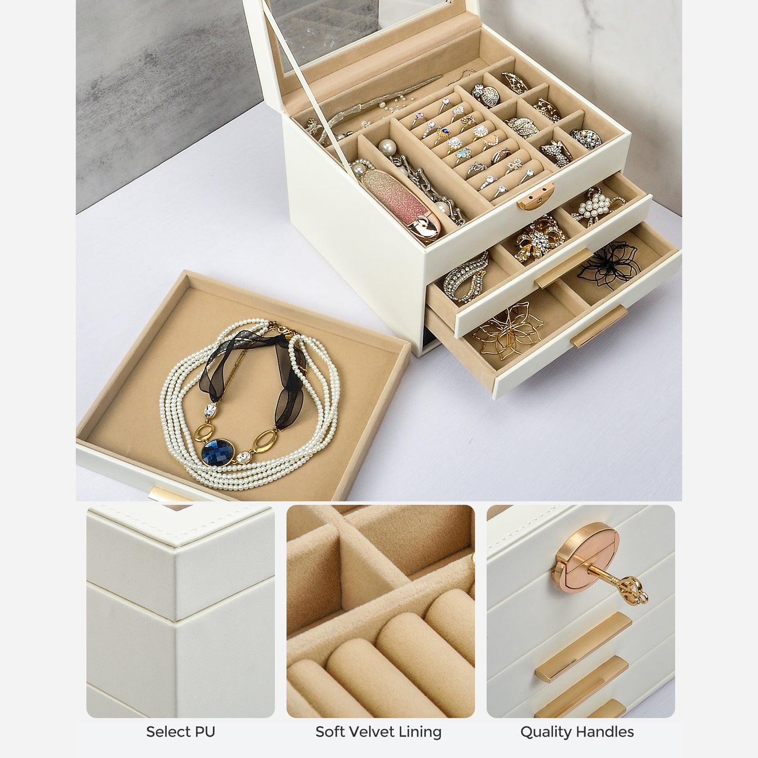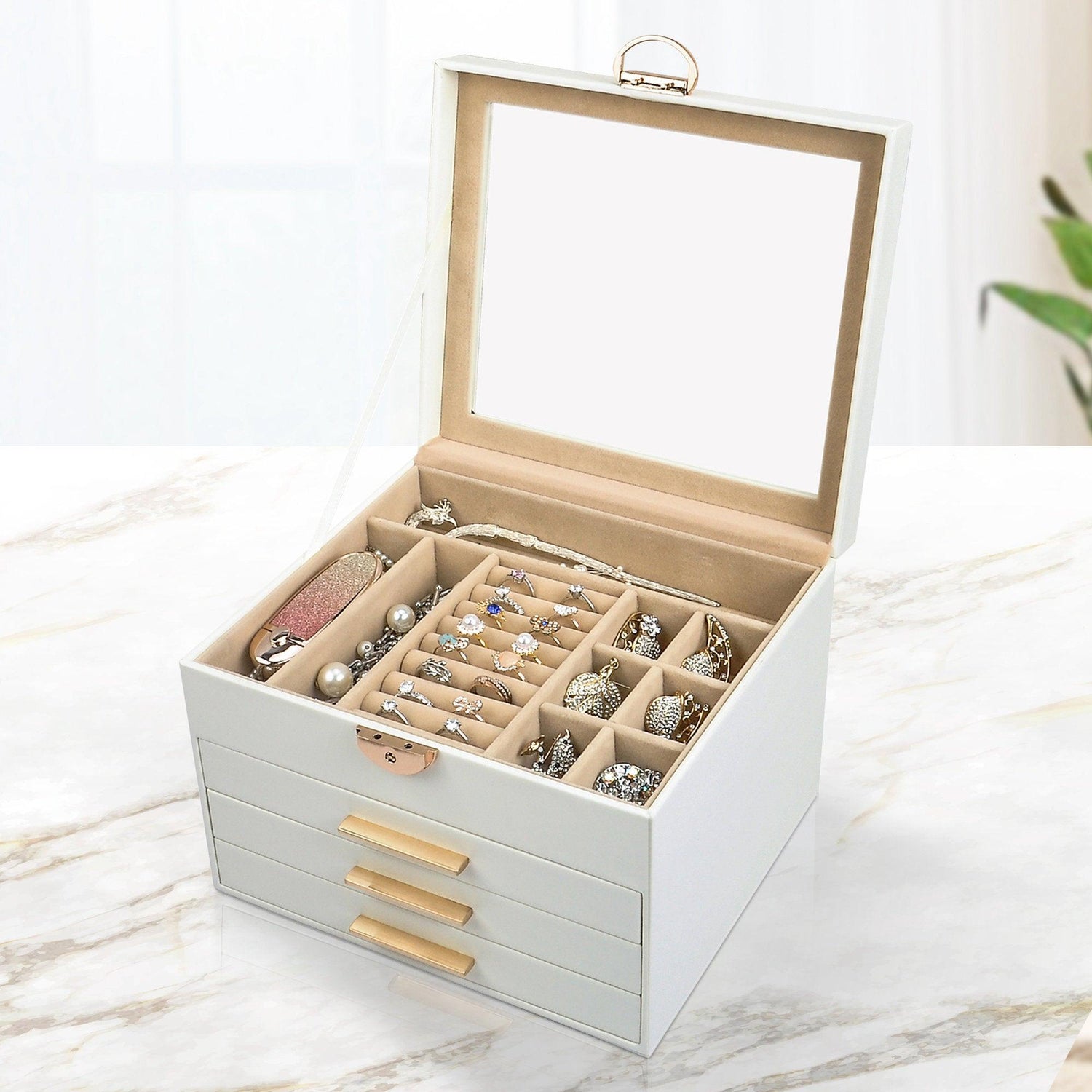- This large jewelry box has been upgraded in capacity. The 4-layer internal structure is designed according to the actual jewelry size. 3 drawers and removable partitions provides ample storage space for all your precious jewelry.