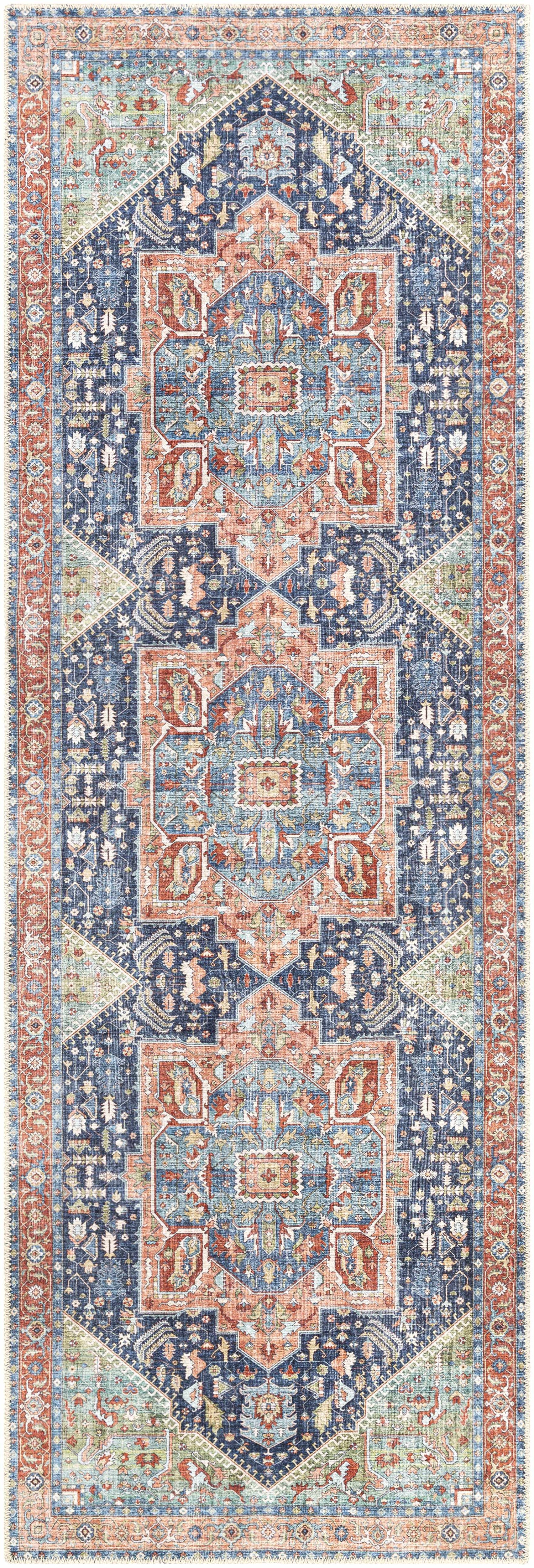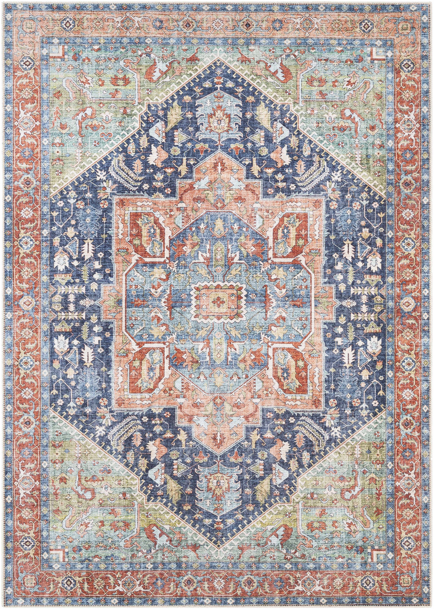 About: The Exira Washable Area Rug features a timeless traditional medallion design in vibrant multi-color tones. This rug effortlessly brings a fresh, unique atmosphere to any room, adding both style and comfort. Perfect for enhancing the decor of various spaces, it's durable, easy to clean, and versatile.
