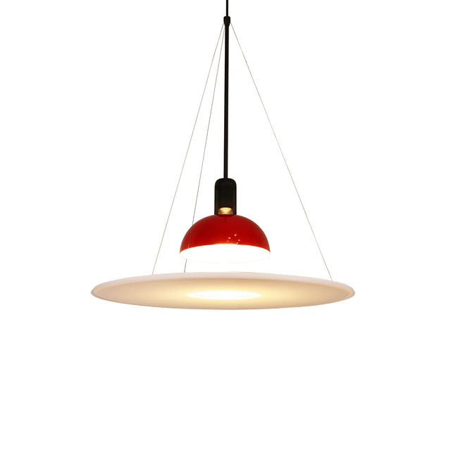 Experience a combination of focused, soft, and radiating light with the Frisbi Acrylic Pendant Light. This light showcases a delicate diffuser, created using injection molding and suspended by three slender steel cables. Its glossy white interior, made from varnished sheet metal, is perfectly complemented by a polished, nickel-plated reflector.