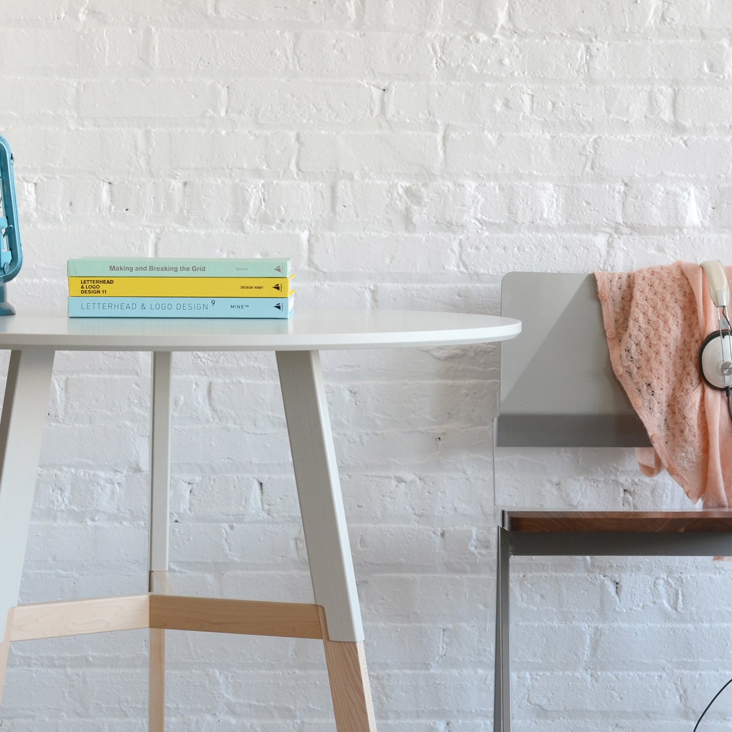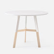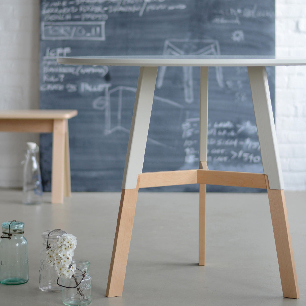 The 1/2 Nelson is a modern take on a classic café table. It boasts a durable powder coated top, with matching leg sleeves, and a handcrafted maple/walnut base. The base is tied together with a unique pinwheel joint.