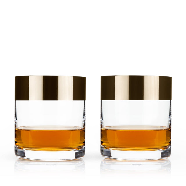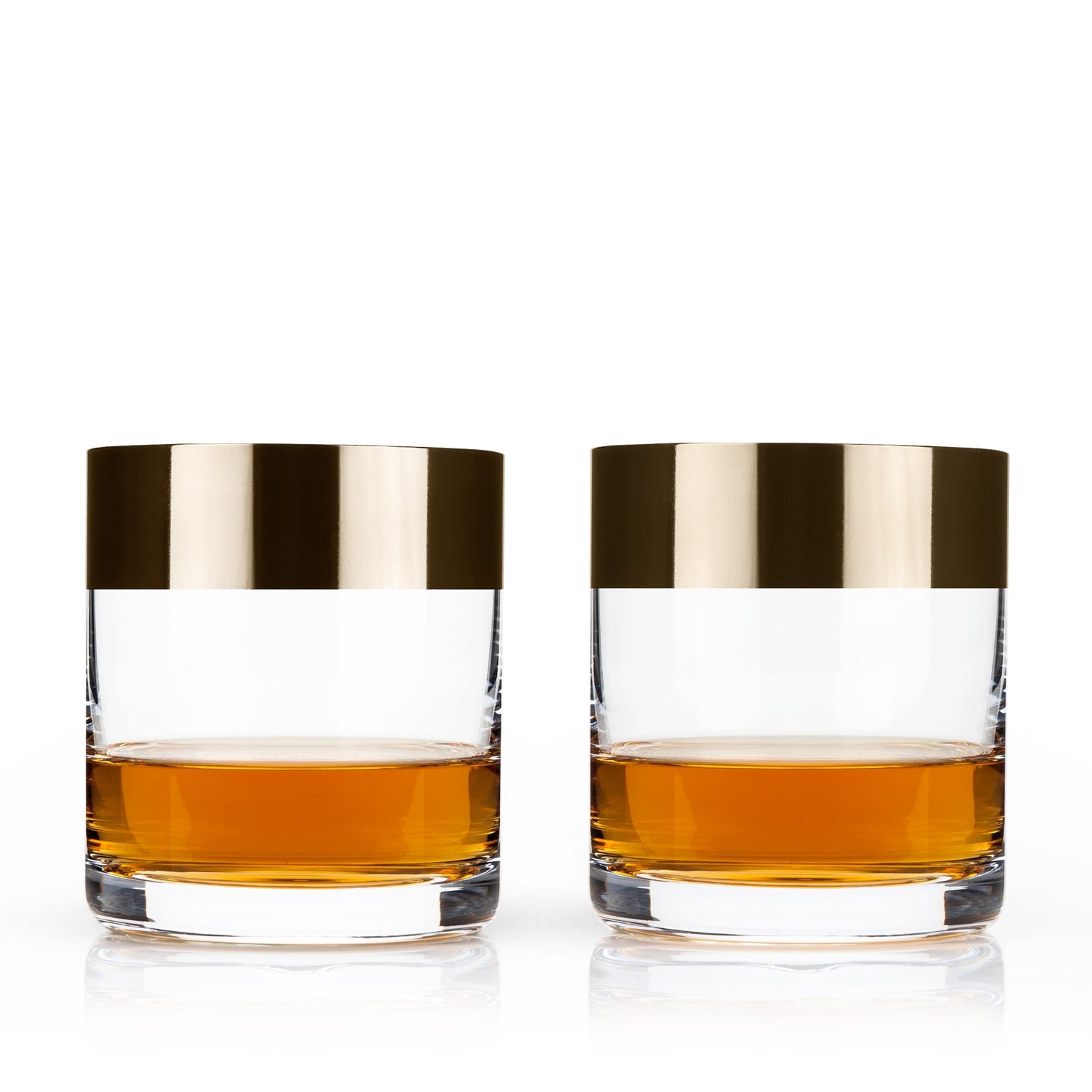This pair of crystal tumblers resurrects the streamlined aesthetics of mid-century modern design, with linear sides and sleek bronze trim worthy of the corner office.