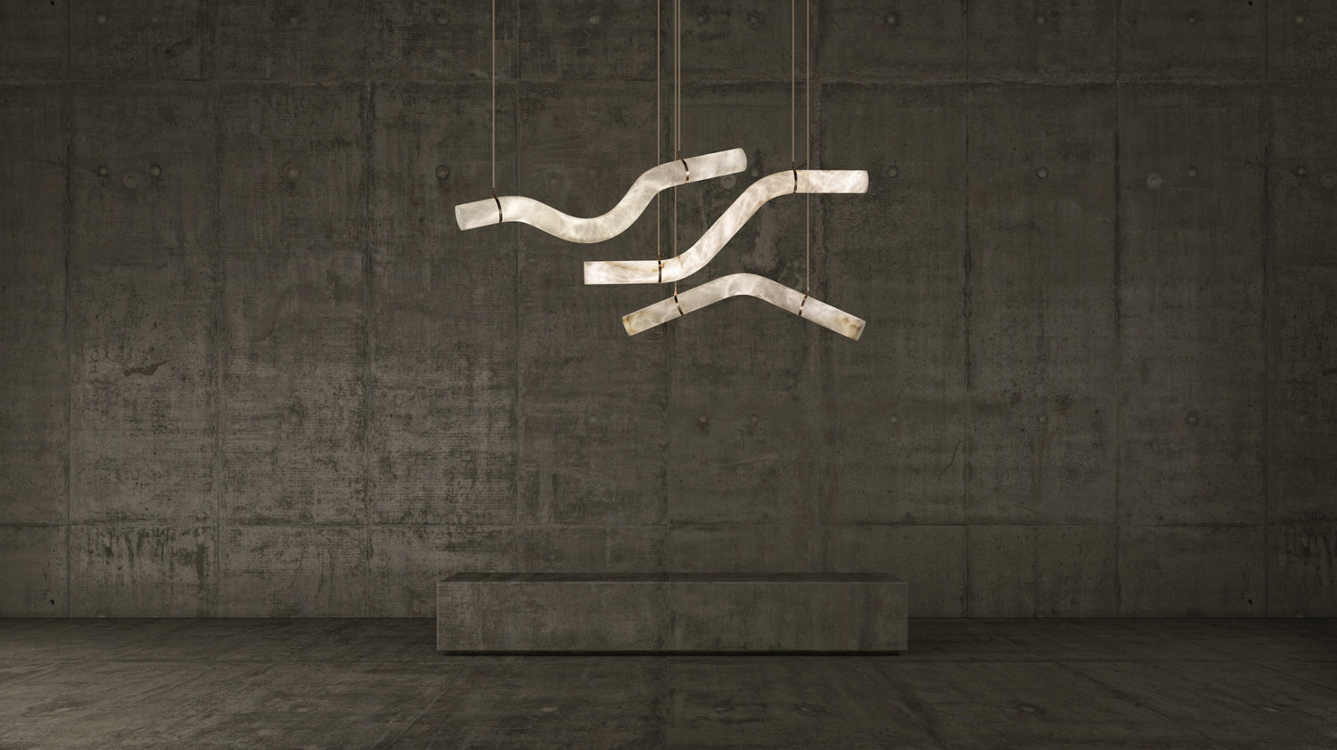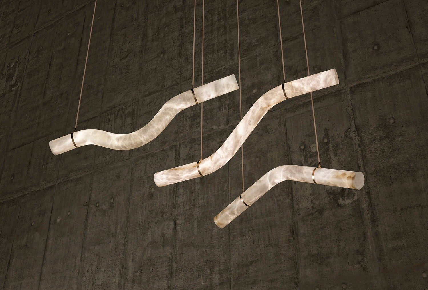 Hanging from leather-covered steel cables, the Liberty Hanging Light introduces movement and shape to the space above a room while diffusing a soft, ambient glow. Whether hanging on its own, in a pair or as a complete trio, the alabaster pendant presents a dialogue between form and function, design and art, space and light.