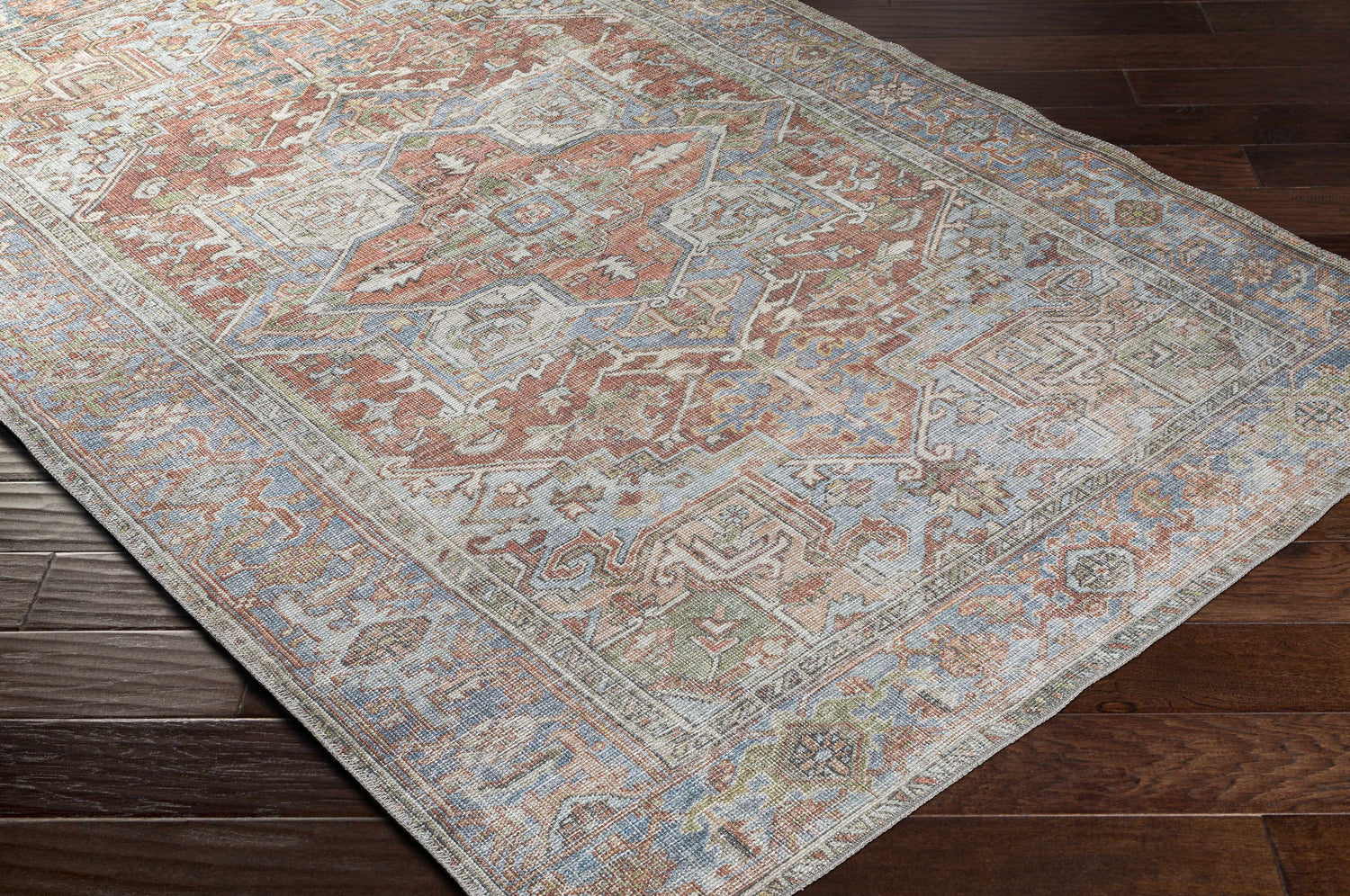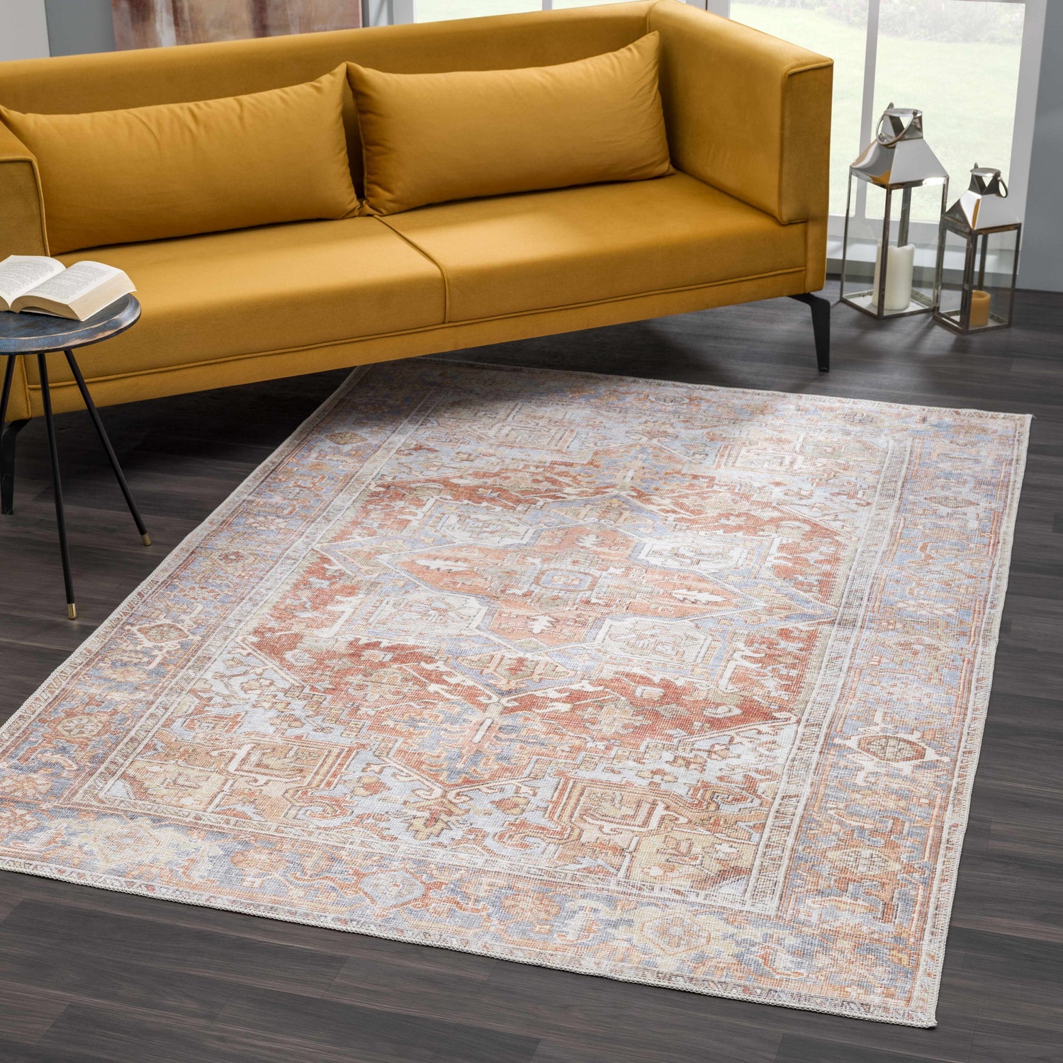 About: Combining many colors such as rust, coral, light orange, different tones of blue, and even sage in a balanced way, our Maayon Washable Area Rug will spice up your space with its colors. We are sure you will love this vintage-style washable rug! |