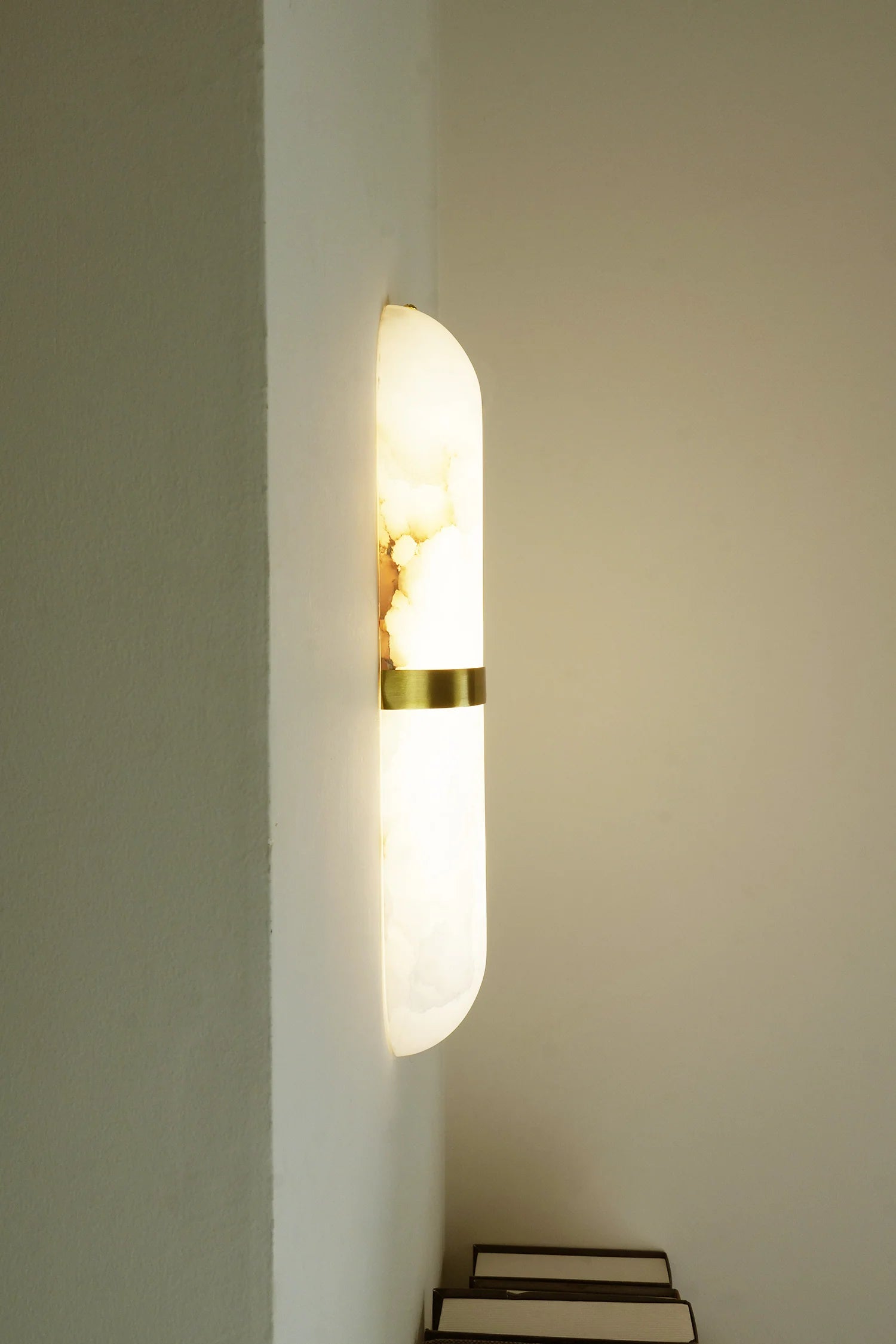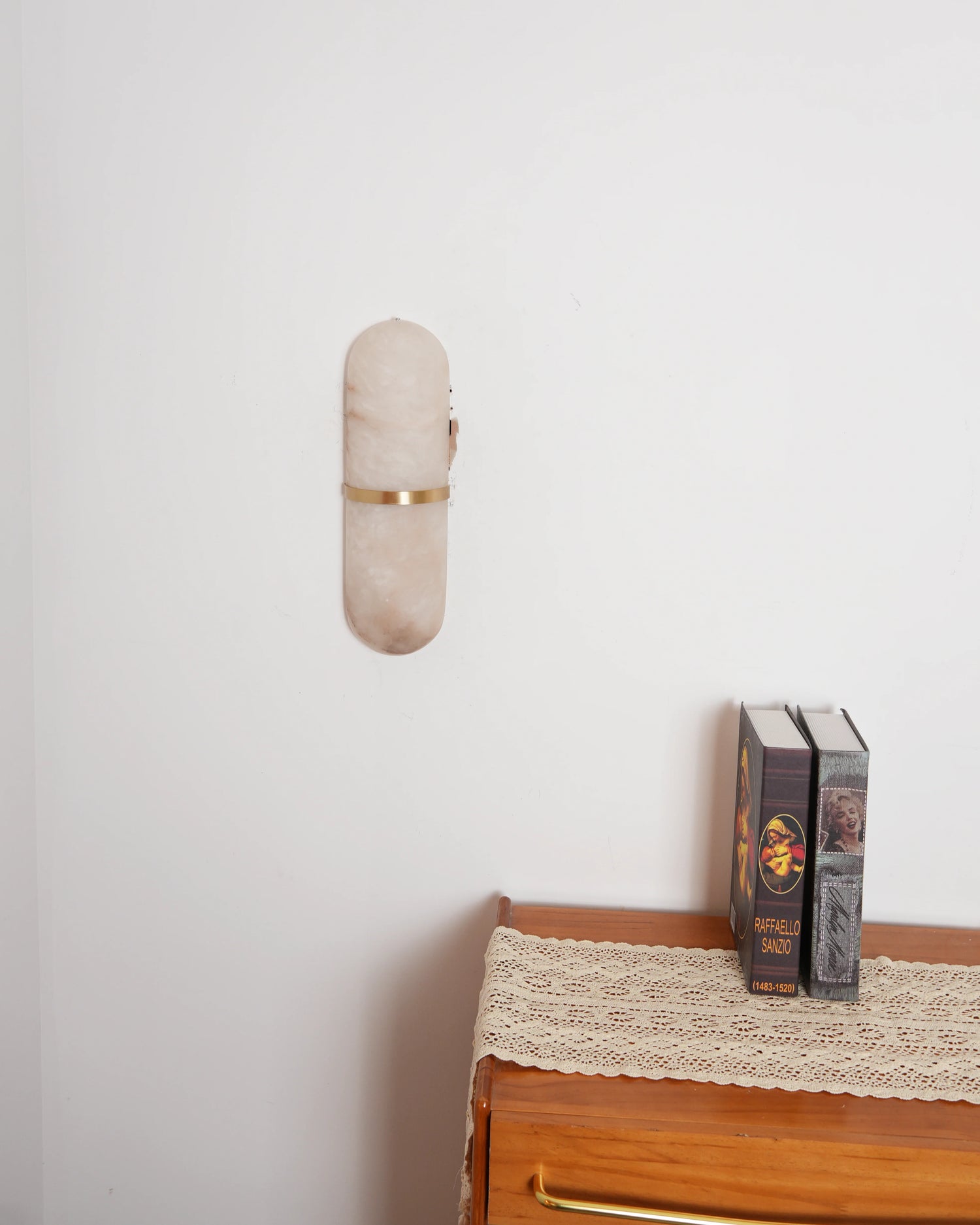Sleek, sculptural, and effortlessly elegant—the Melange Pill Form Alabaster Wall Light redefines modern lighting with its clean form and luxurious materials. Featuring a pure alabaster shade wrapped in a bold metal band, this fixture blends contemporary simplicity with timeless texture.