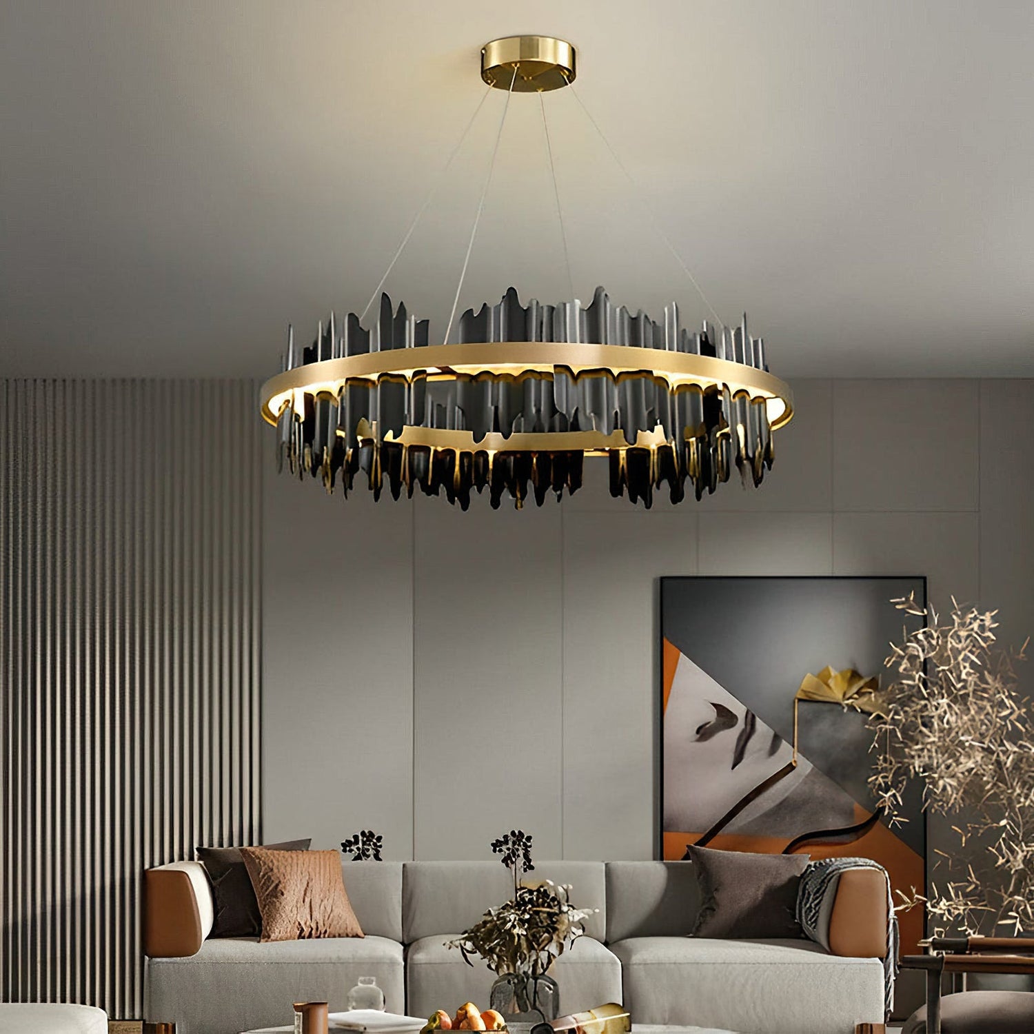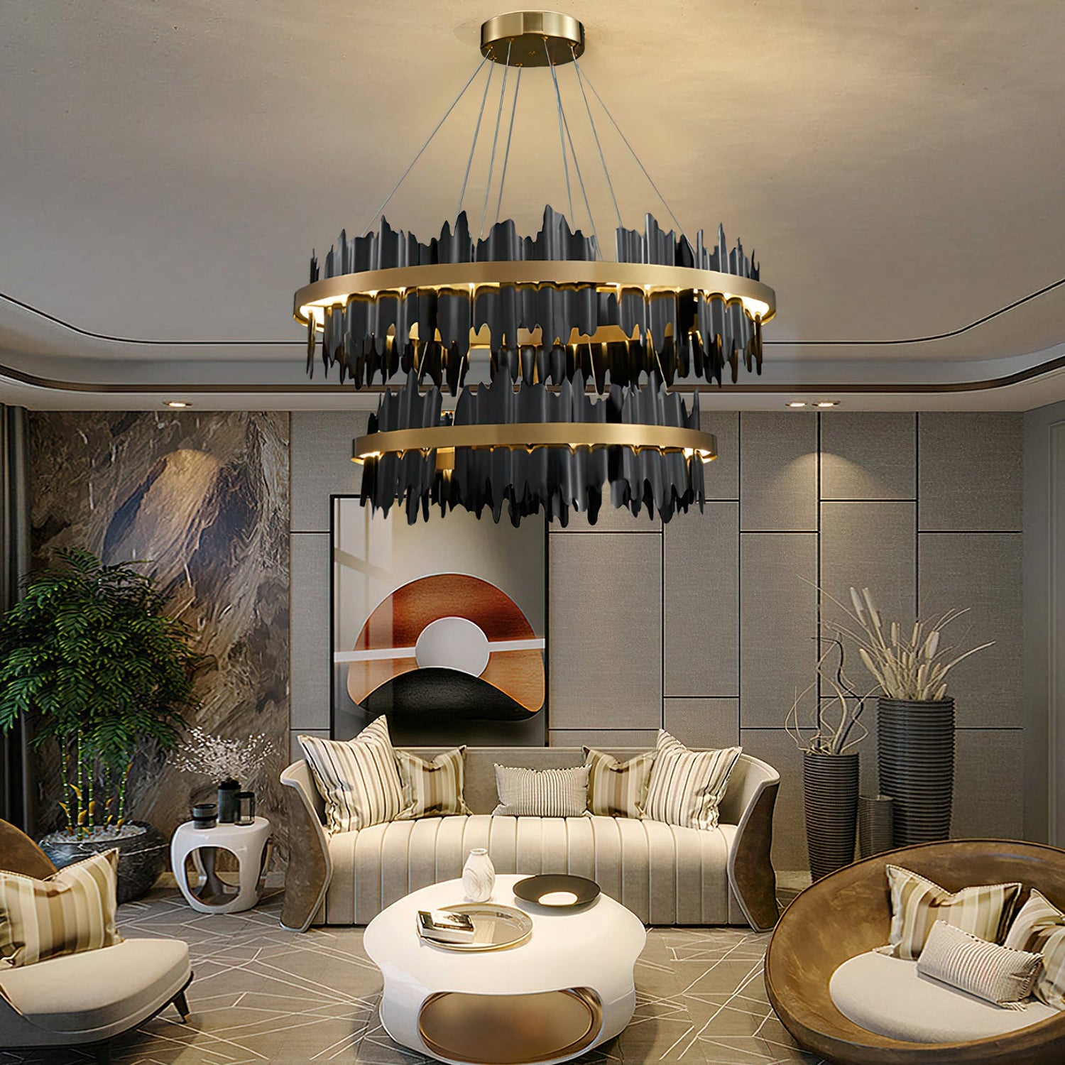Elevate your home's aesthetic with the Midnight Shadow Chandelier. This exquisite piece showcases a sophisticated design inspired by the enigmatic and captivating shadows of midnight, complete with a luxurious finish. With meticulous attention to detail and premium materials, this chandelier is a masterpiece of craftsmanship. Install it in your entryway, living room, or dining room for a touch of refinement and grace. The adjustable height feature allows for a perfect fit in any space, while the LED bulbs emit bright and warm light while also being eco-friendly.