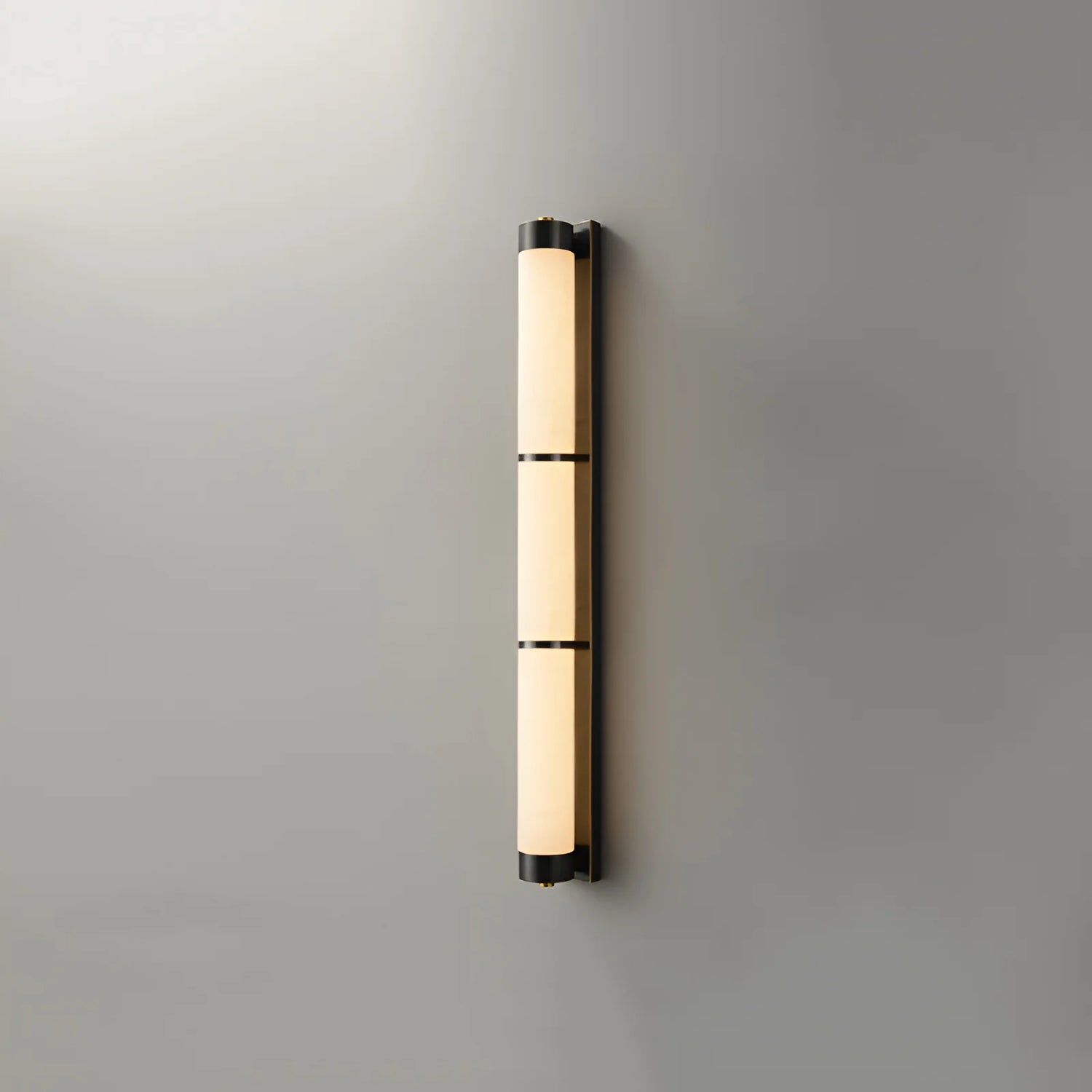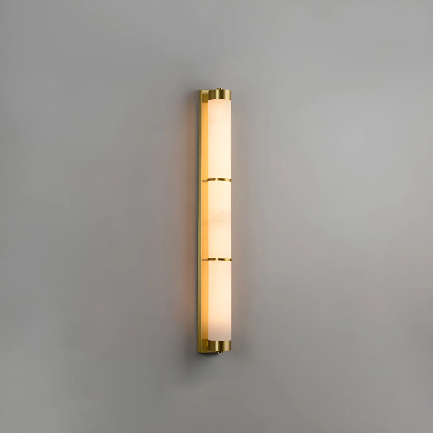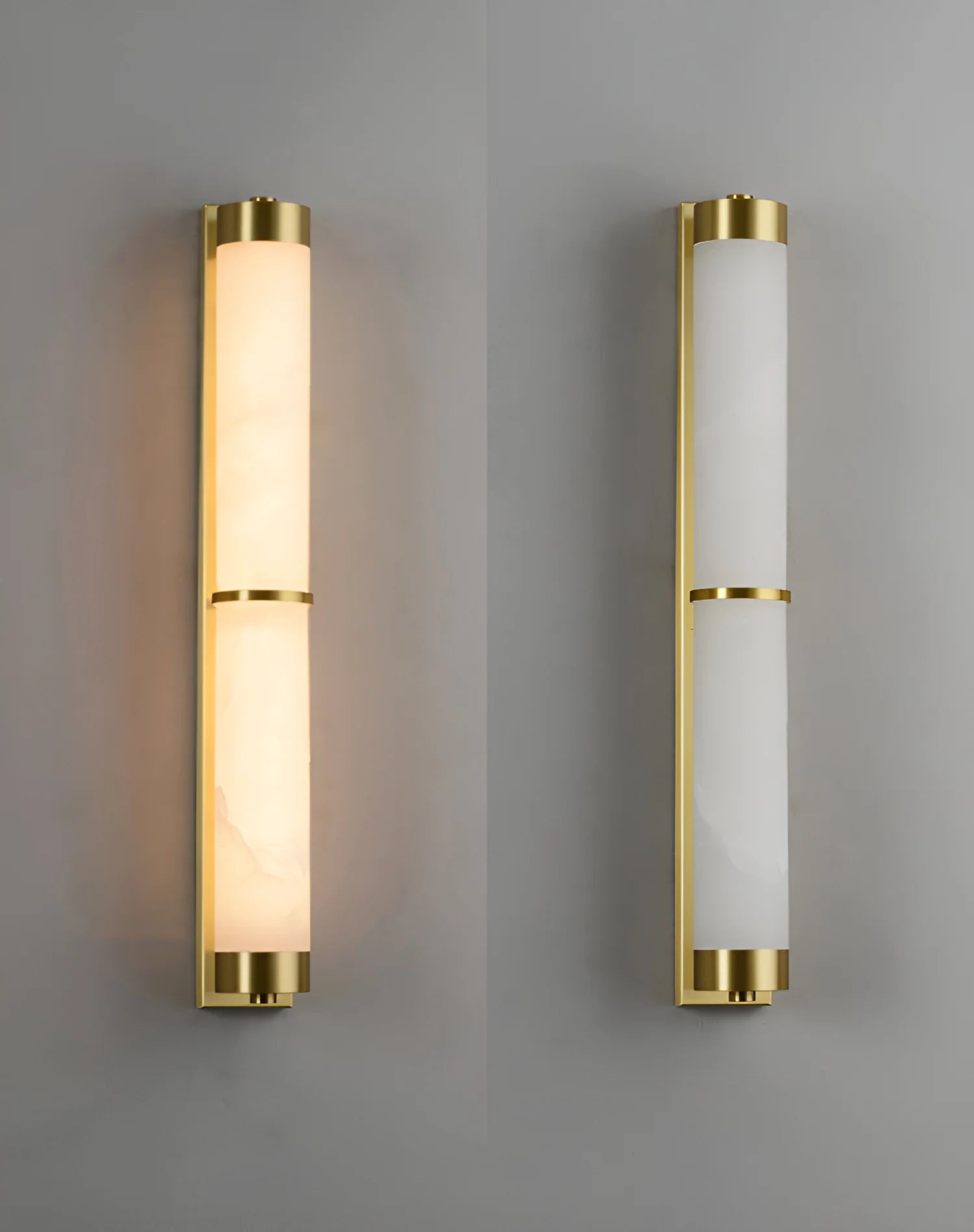 Modern Cylindra Alabaster Brass Wall Light, Experience the exquisite charm and sophistication. Made with premium brass and featuring a cylindrical alabaster shade, this light source emits a comforting, soft light that highlights the distinctive veining and smooth texture of the alabaster.