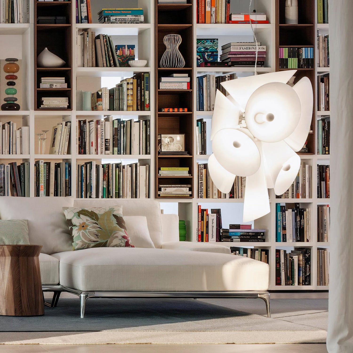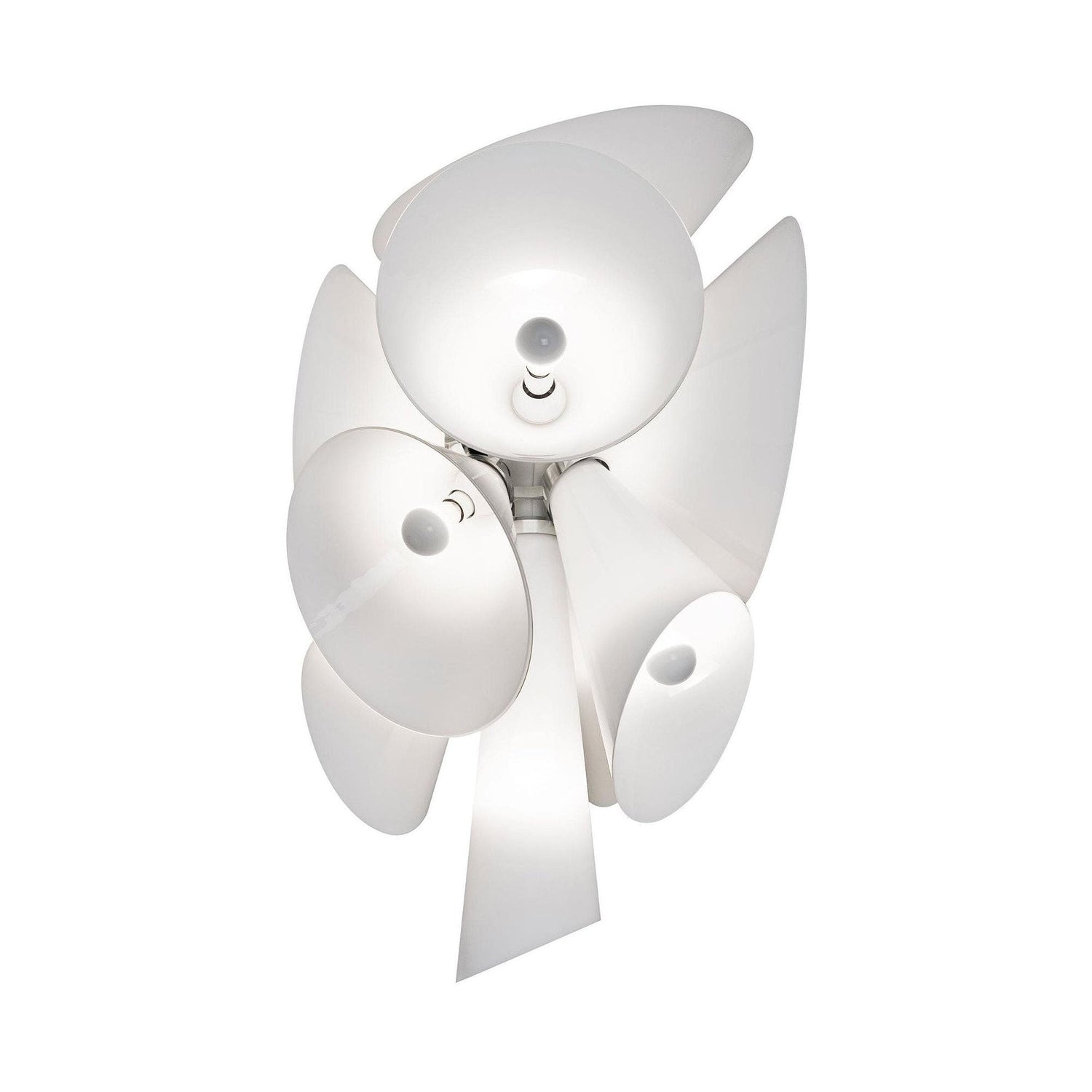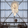 Provides a chandelier that diffuses light. Die-cast aluminum central body and 10 blown glass cones of different sizes. The cone is assembled through a bayonet system for easy cleaning. Die-cast aluminum ceiling fixture with automatic cable locking system. Polycarbonate wreath.