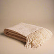 Wool throw woven on a pedal loom in Panipat, India. Cream Color with wool fringe.