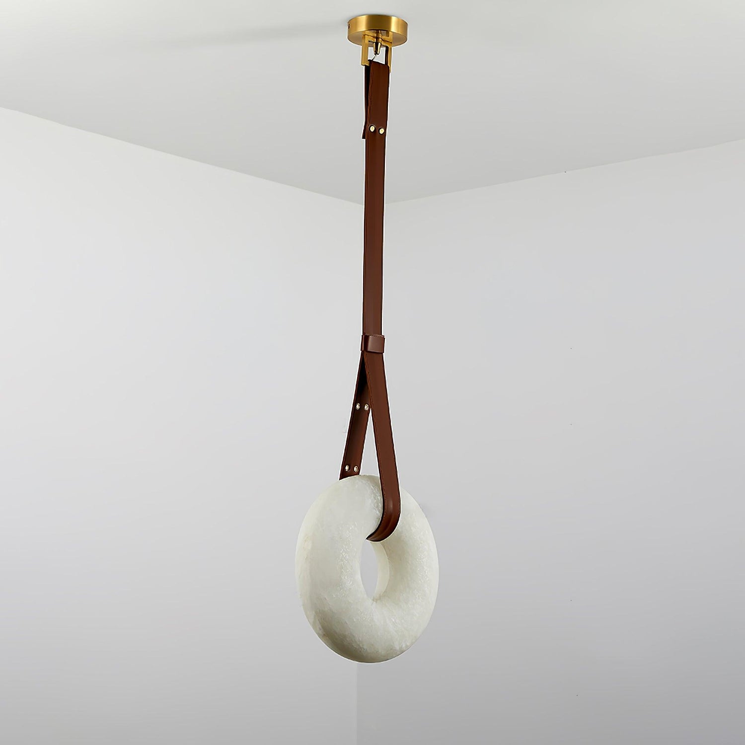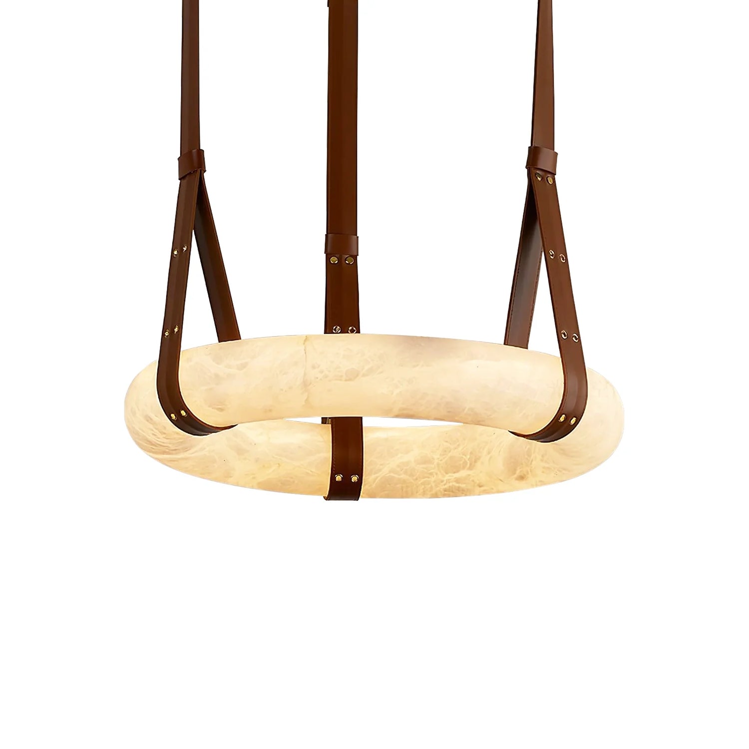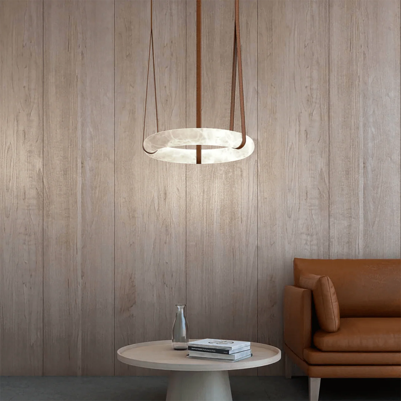 Alone or in clusters, Oslo’s glowing rings shine in space. Its light weight is played up by soft leather fasteners.