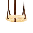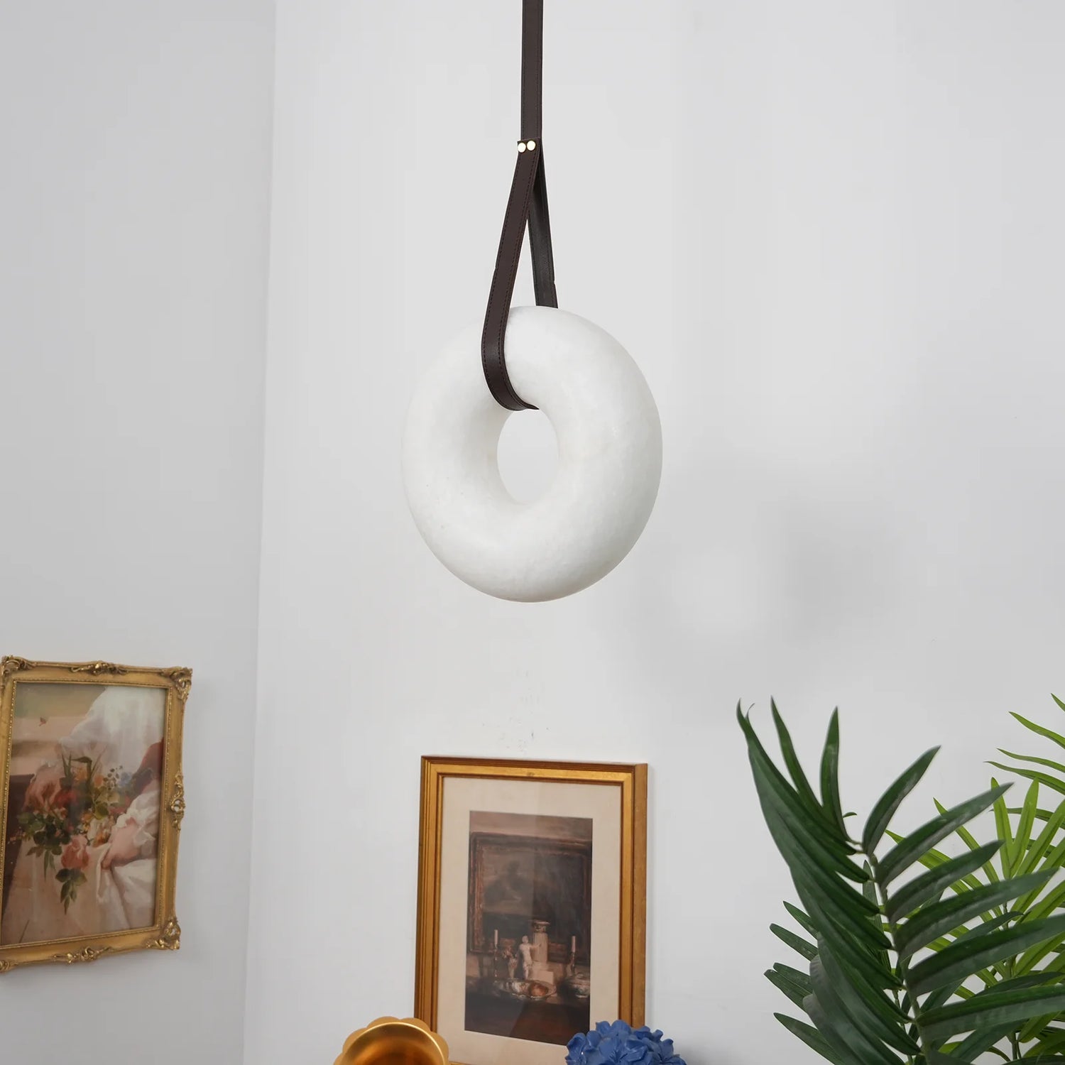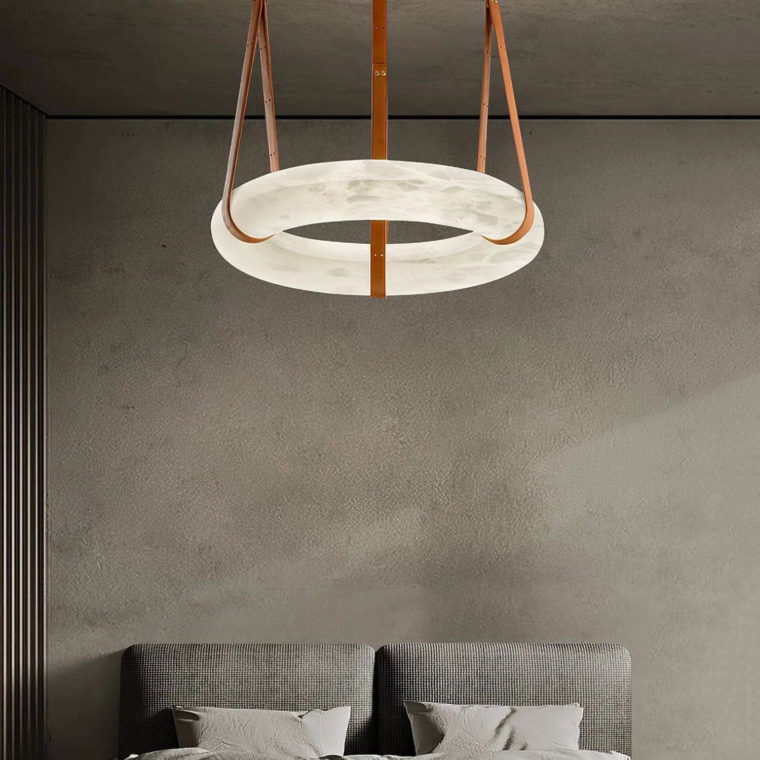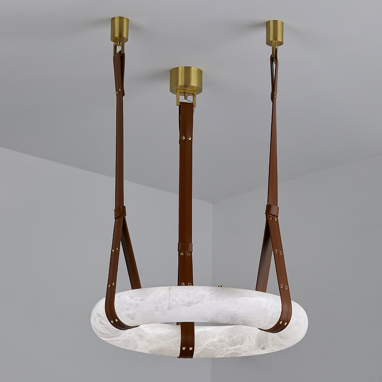 Alone or in clusters, Oslo’s glowing rings shine in space. Its light weight is played up by soft leather fasteners.