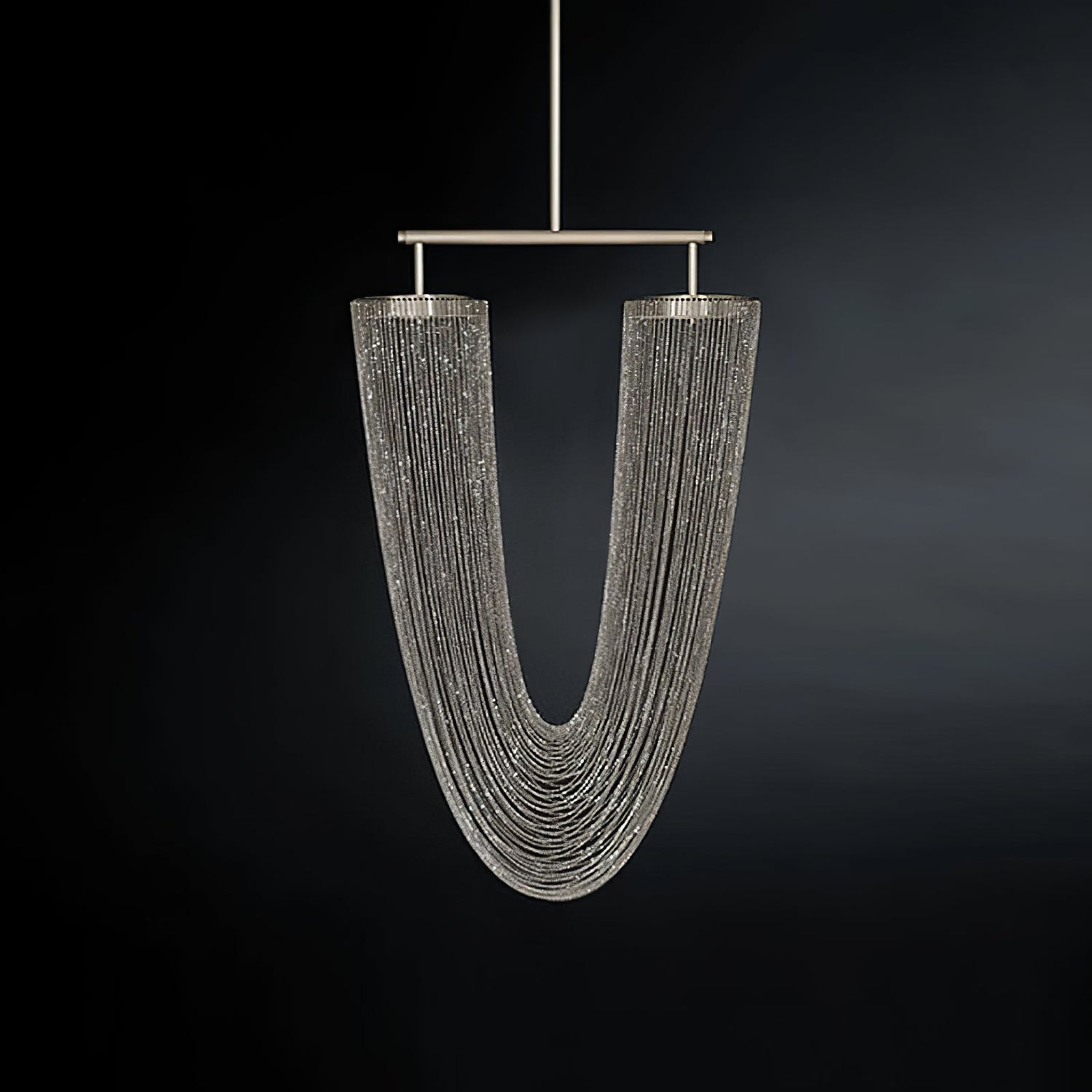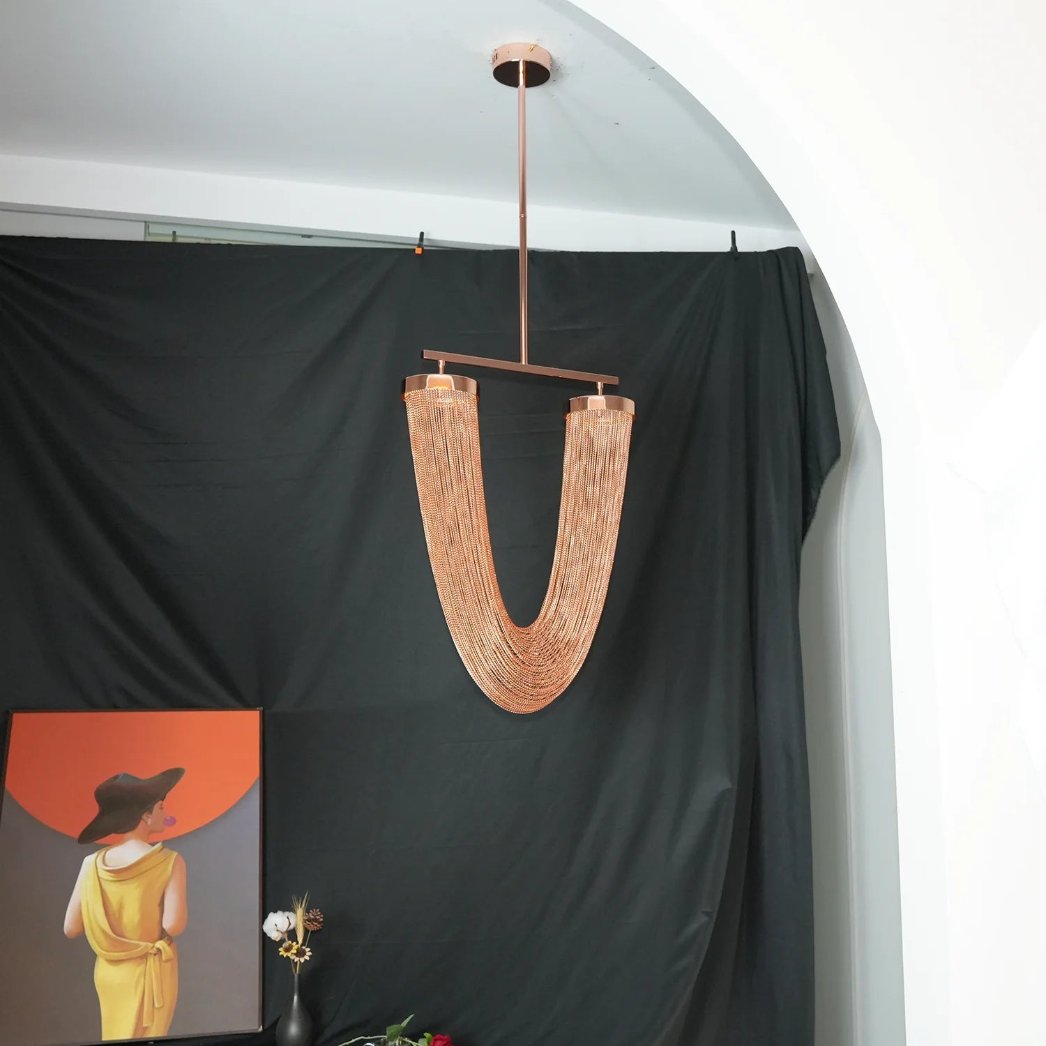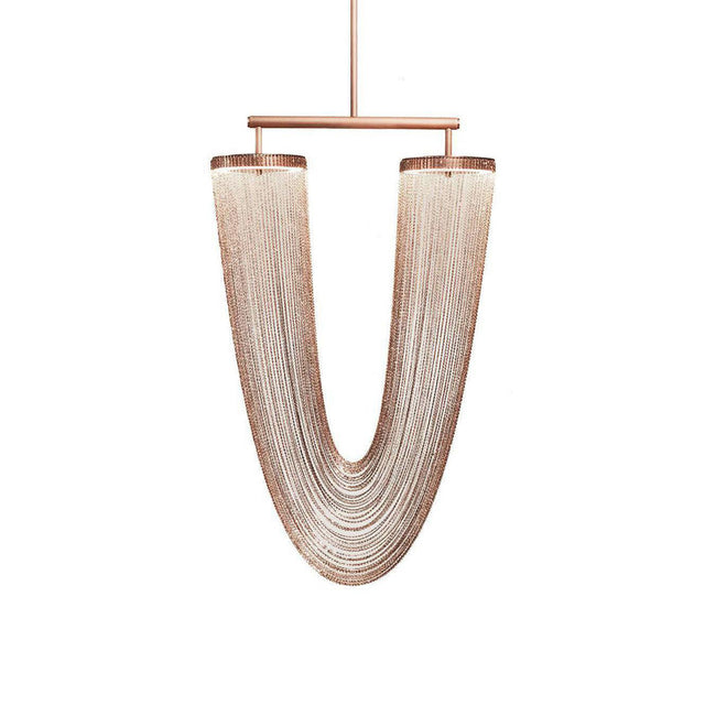 It is with a poetic beauty captured in this luxurious high-end lighting fixture that has been coated with warmth and elegance, that it will infect your daily life. This sculptural light is hand-crafted with delicate copper chains to create a unique and elegant curved shape inspired by the romantic world of jewelry. The light itself comes from two copper rings and goes through the chains to create a magic atmosphere.