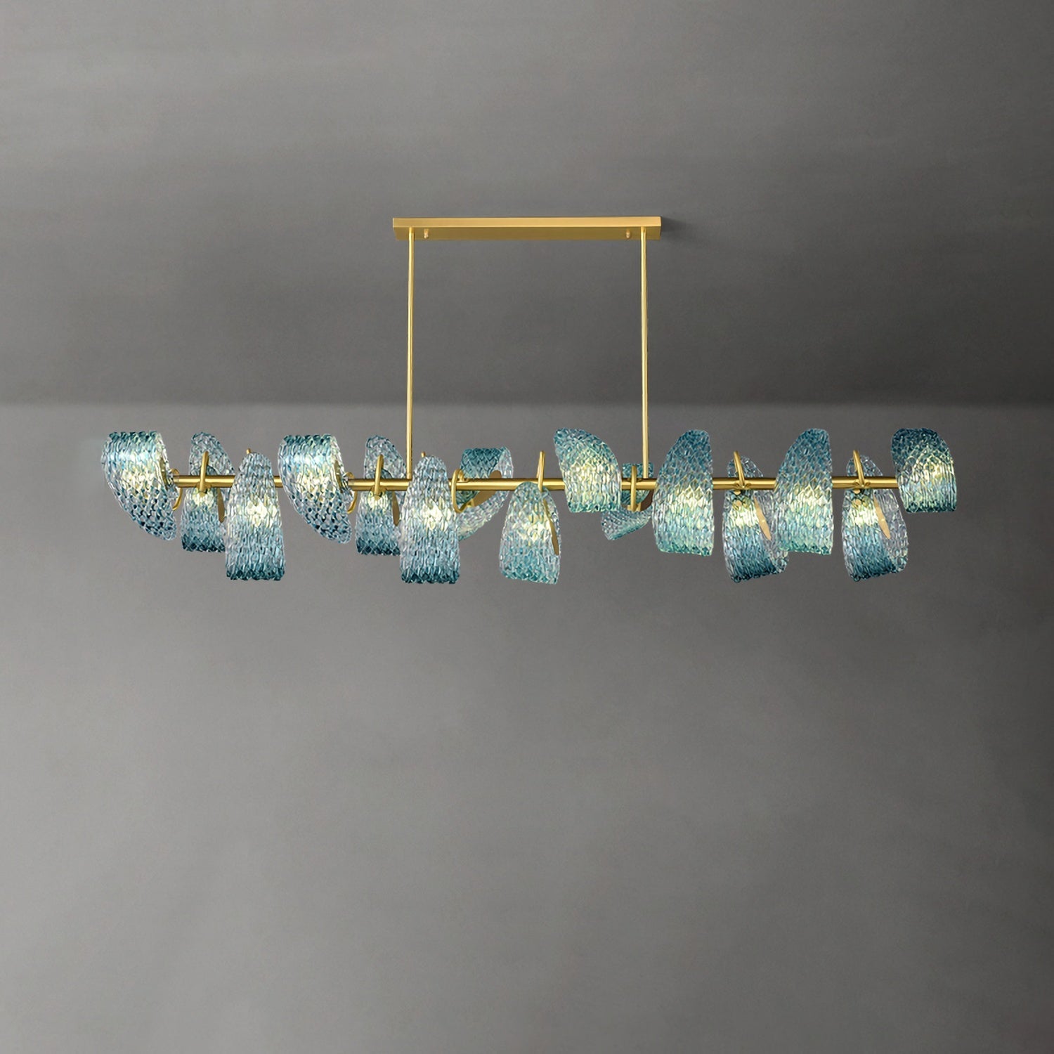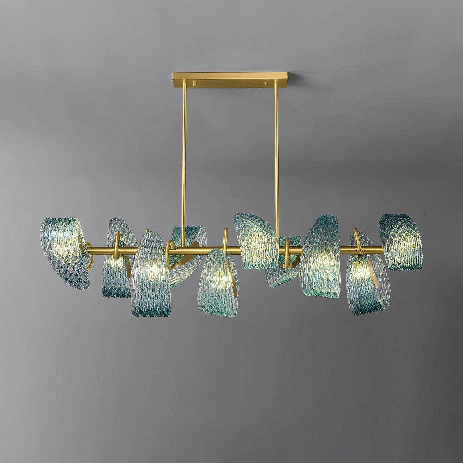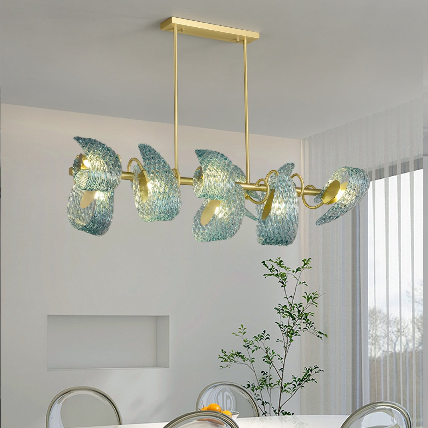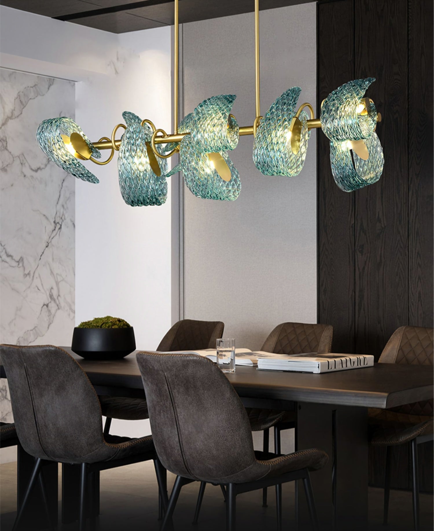 This Petal Blue Chandelier features a design with an all-copper body and a blue glass shade, combining blue and gold petal art to create a mysterious and noble aura. The handmade craftsmanship enhances the glass's textured appearance, adding a unique charm to the radiant light and shadow. This chandelier is the perfect addition to elevate your living space into a true work of art. Please note: Your payment does not cover customs duties, local taxes, or any other import fees.