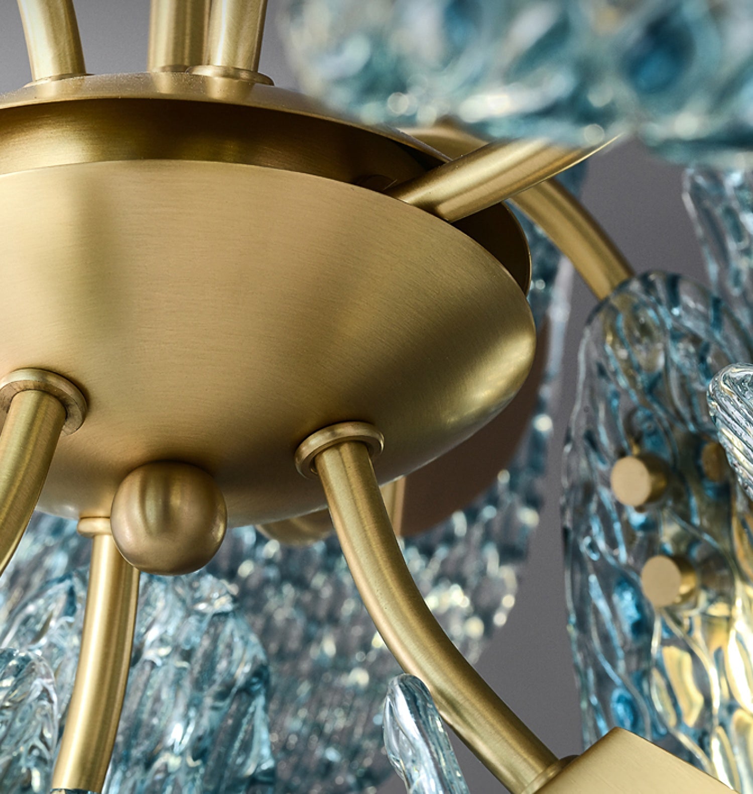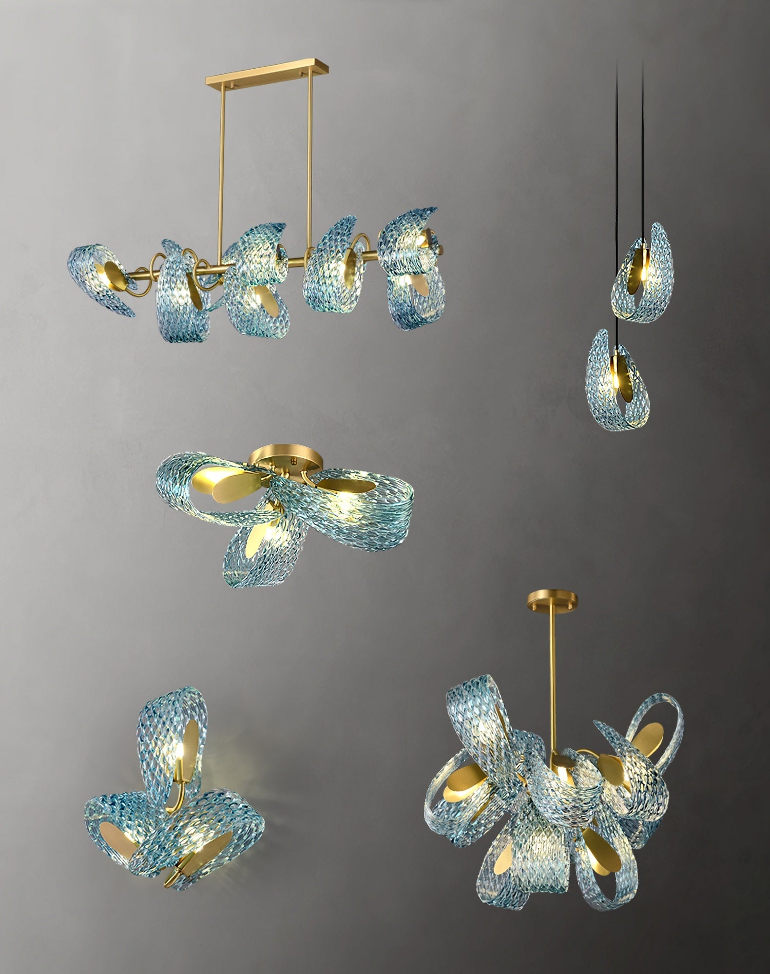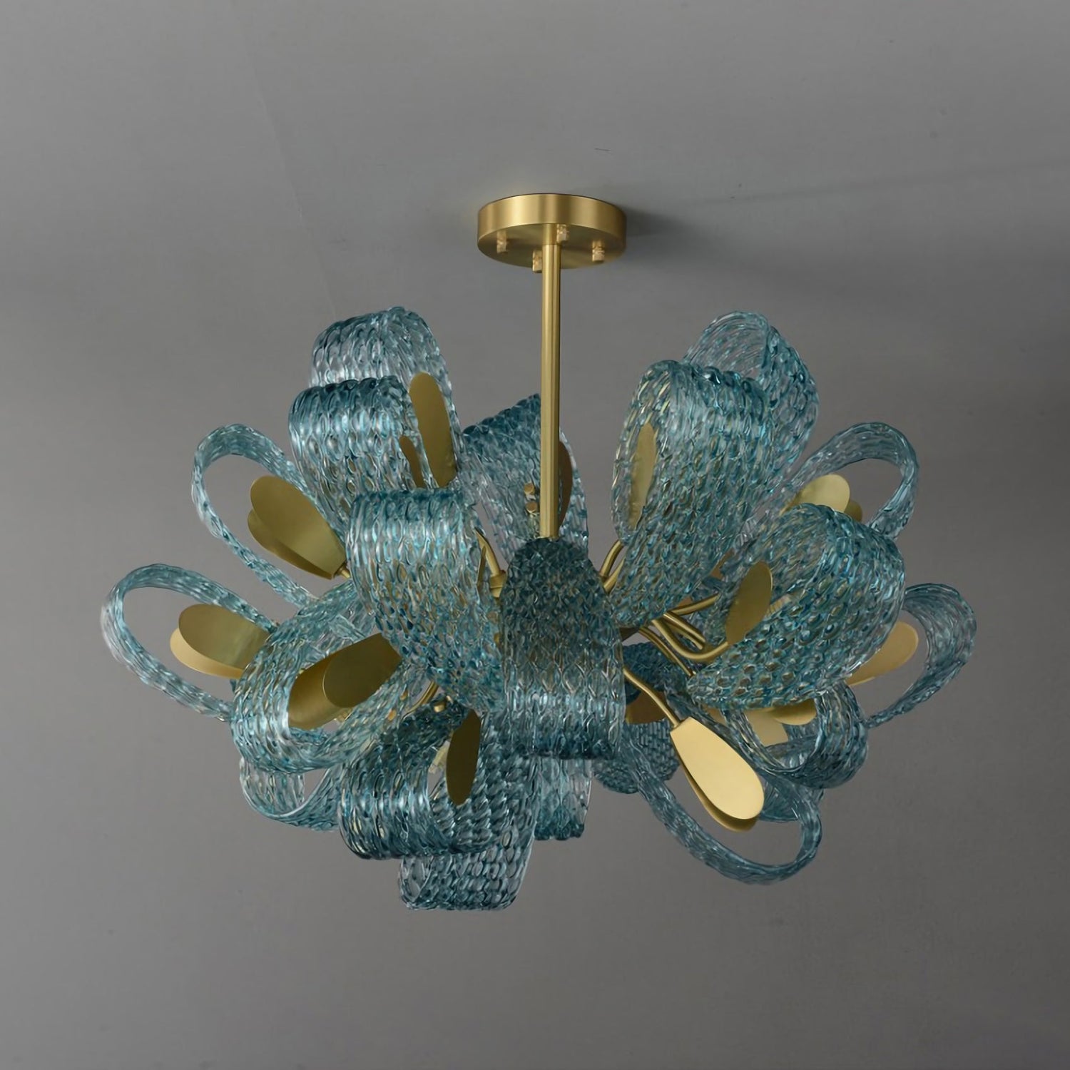 Bring unprecedented visual impact and luxurious artistry to your space with this Petal blue glass art chandelier! More than just a light fixture, it's a blue sculpture blooming on the ceiling, instantly elevating your living room or dining room into a luxurious retreat. The chandelier's shade is composed of intricate blue glass petals, meticulously handcrafted to create unique textures and captivating interplay of light and shadow. This makes it the perfect focal point for your living room, high-ceilinged space, or upscale clubhouse.