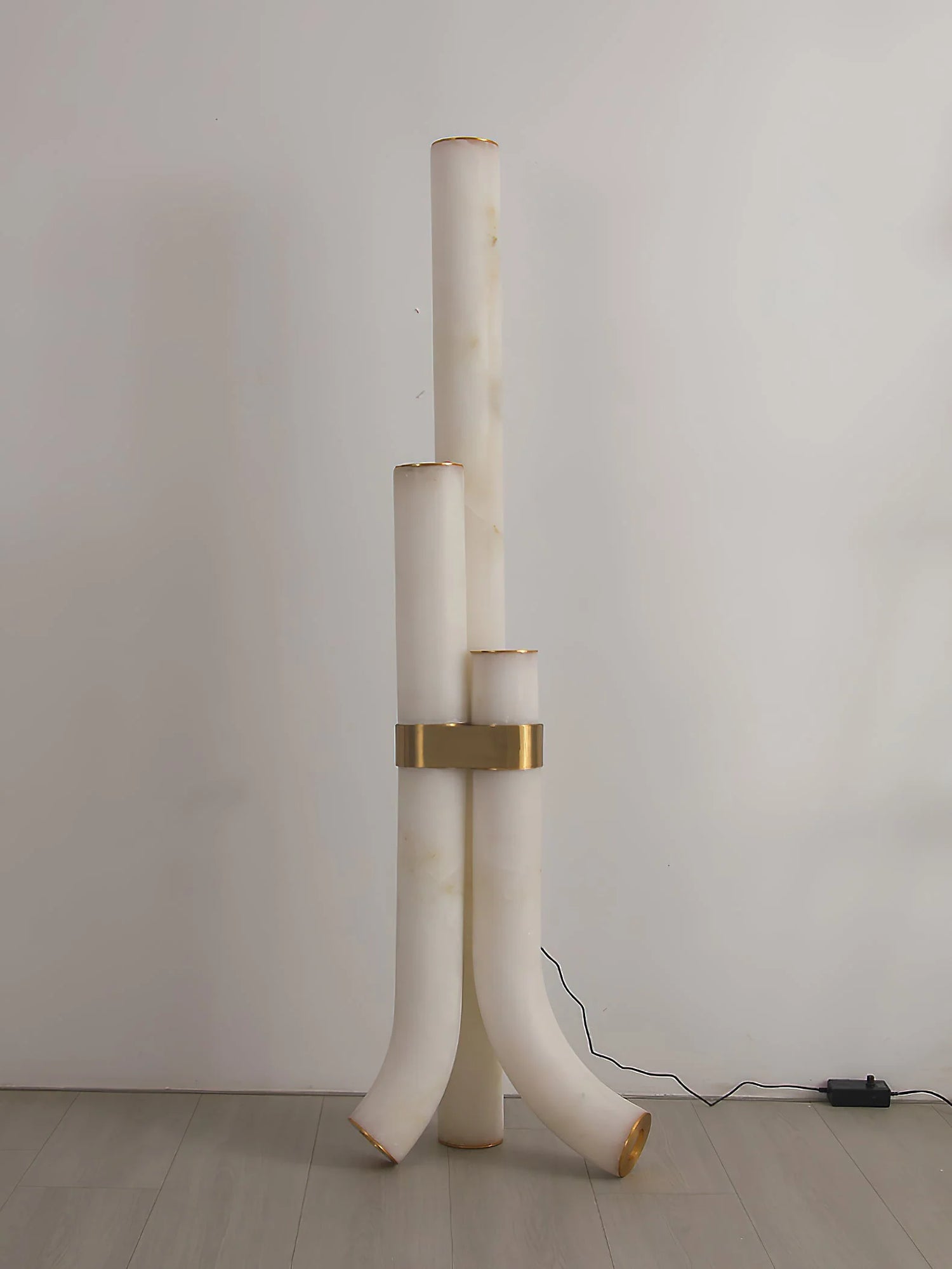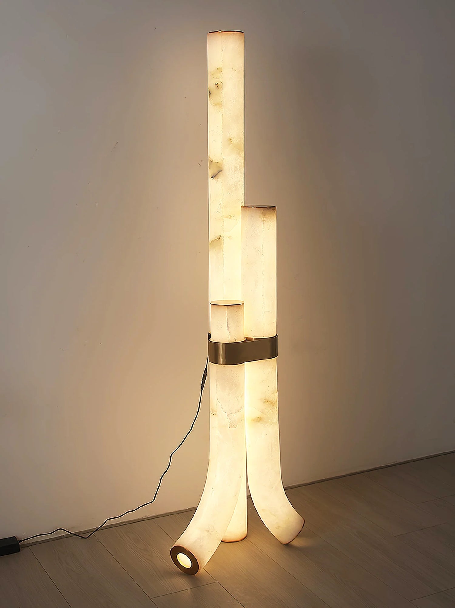 Add a touch of modern elegance to any room with our Piped Alabaster Floor Lamp. The sleek geometric design features three marble shades for a minimalistic look, while providing a warm, sophisticated atmosphere. Illuminate your space with the natural beauty of stone.