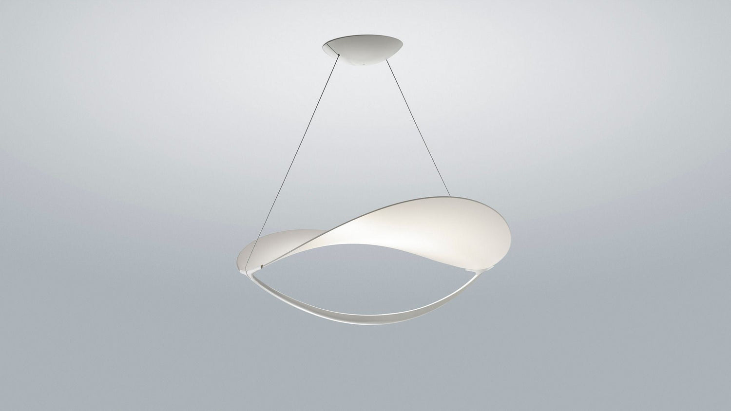The impressive Plena Pendant Light from the house is a real treat in both shape and function. The name refers to the moon, depicted here by the diffuser. This is coated with a highly-reflective, two-layered plastic canvas, which is held and shaped by a white-painted frame. A white aluminium arm below provides uplighting, which is elegantly reflected down by the canvas. The light that shines out makes it ideal as table lighting, as it never blinds and still provides plenty of light.