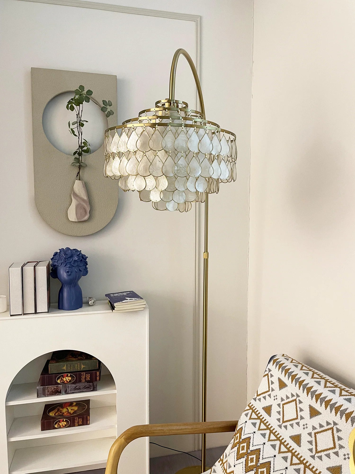 The Shell Teardrops Arc Floor Lamp features a gold body and elegant shell embellishments, combining sophistication with luxury. Add a touch of elegance to any space. Let its warm glow and sophisticated design elevate your home decor.