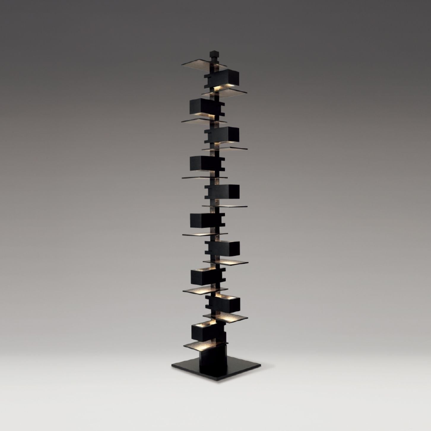 Transform your space with the Taliesin Floor Lamp, showcasing a one-of-a-kind tower design crafted from stacked solid wood boxes. The soft and gentle radiance bouncing off the wooden surface emulates the soothing ambiance of natural sunlight, evoking a sense of tranquility.