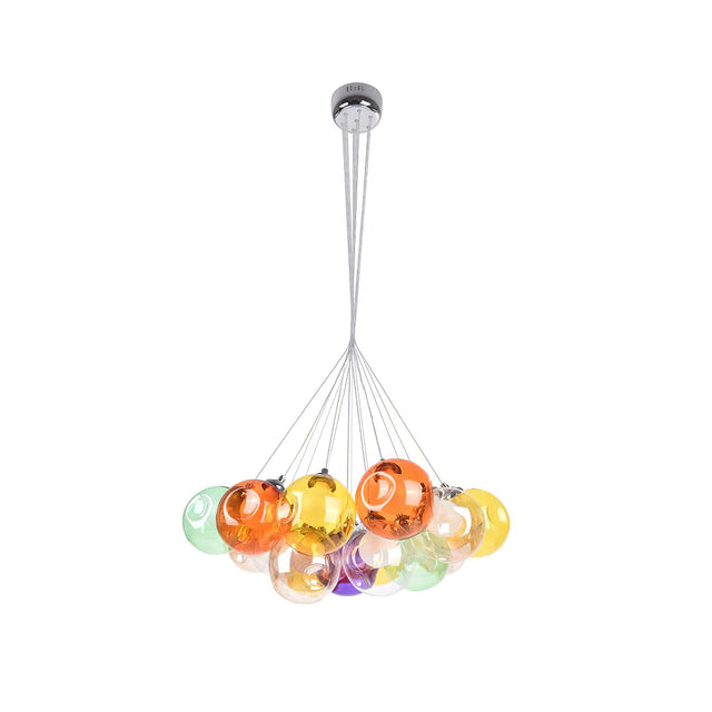 As a fabulous fixture that provides ambient lighting, this multi-color globe cluster chandelier elevates your interior by its unique and alluring appearance. The hanging cables lead down to a cluster of lights (from 7 to 50 lights), each highlighted by a 5W bulb (not included) with multi-color globe hand-blown glass shade, to create a gentle and astounding glow throughout your space. Two cute colored tones are available to pick. The yellow tone of cluster lights will show you harmony and dreaming ambiance, as the blue tone fixture builds a starry shining and fresh atmosphere to your space. With adjustment for hanging height and compatibility with a sloped ceiling, this globe cluster chandelier applies well to a variety of conditions. Not just suitable for your residential area, like the living room, dining room, kids bedroom, and attic, this modern cluster pendant light also fits those commercial spaces, such as the cafe and studio.