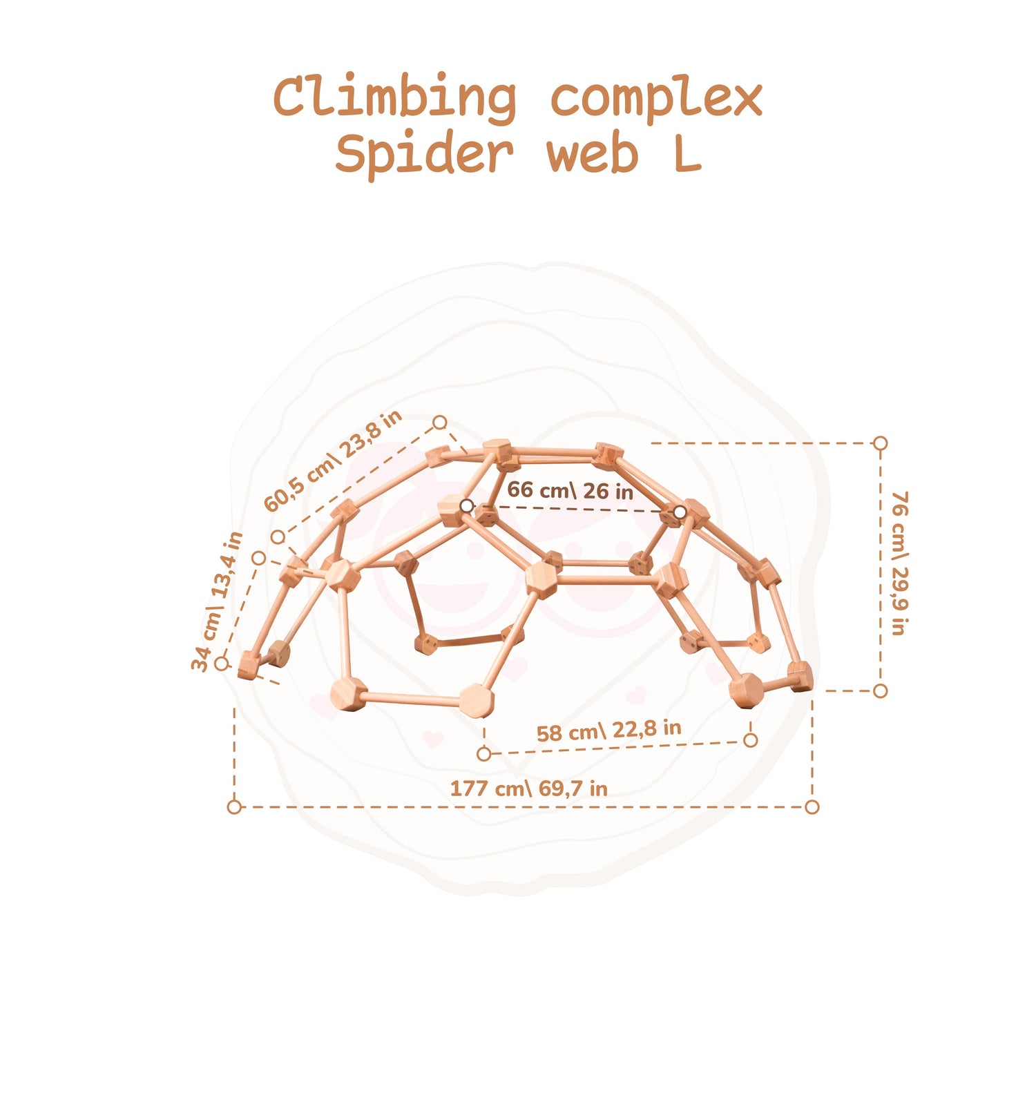 The Wooden Climbing Dome is made of natural beech wood and birch plywood, ensuring the stability of the base and the strength of the structure. The product is tested to withstand loads of up to 100 kg, with a recommended load of 60 kg, allowing children to play on this indoor playground with siblings or friends without compromising safety guidelines. Thanks to its durability and reliability, the climbing frame is designed for a long service life well beyond the two years offered by the warranty. All elements of this Montessori climbing frame are covered with hypoallergenic lacquer or water-based paints, making the product environmentally friendly and safe for children's health. It can even be licked (provided the product and room are kept clean).